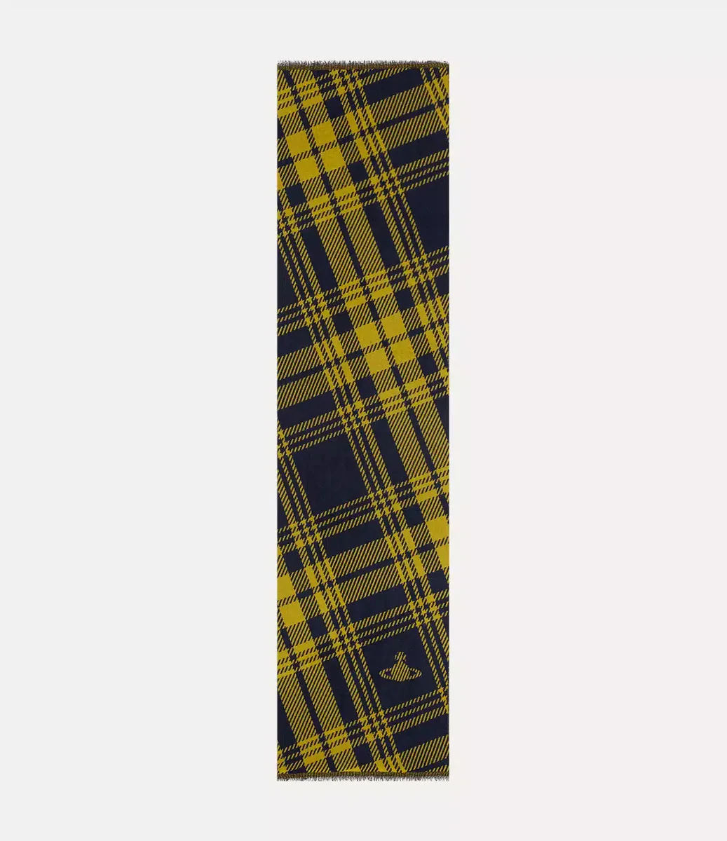 Notre écharpe est confectionnée dans une laine douce et tissée avec un motif tartan, inspiré des tenues traditionnelles des Highlands écossais. De forme rectangulaire classique, elle est dotée de bords légèrement frangés et de l’emblème « Silhouette Orb » de la maison.