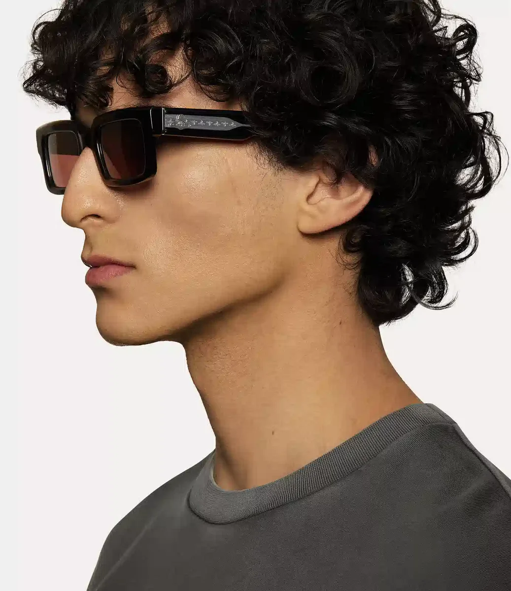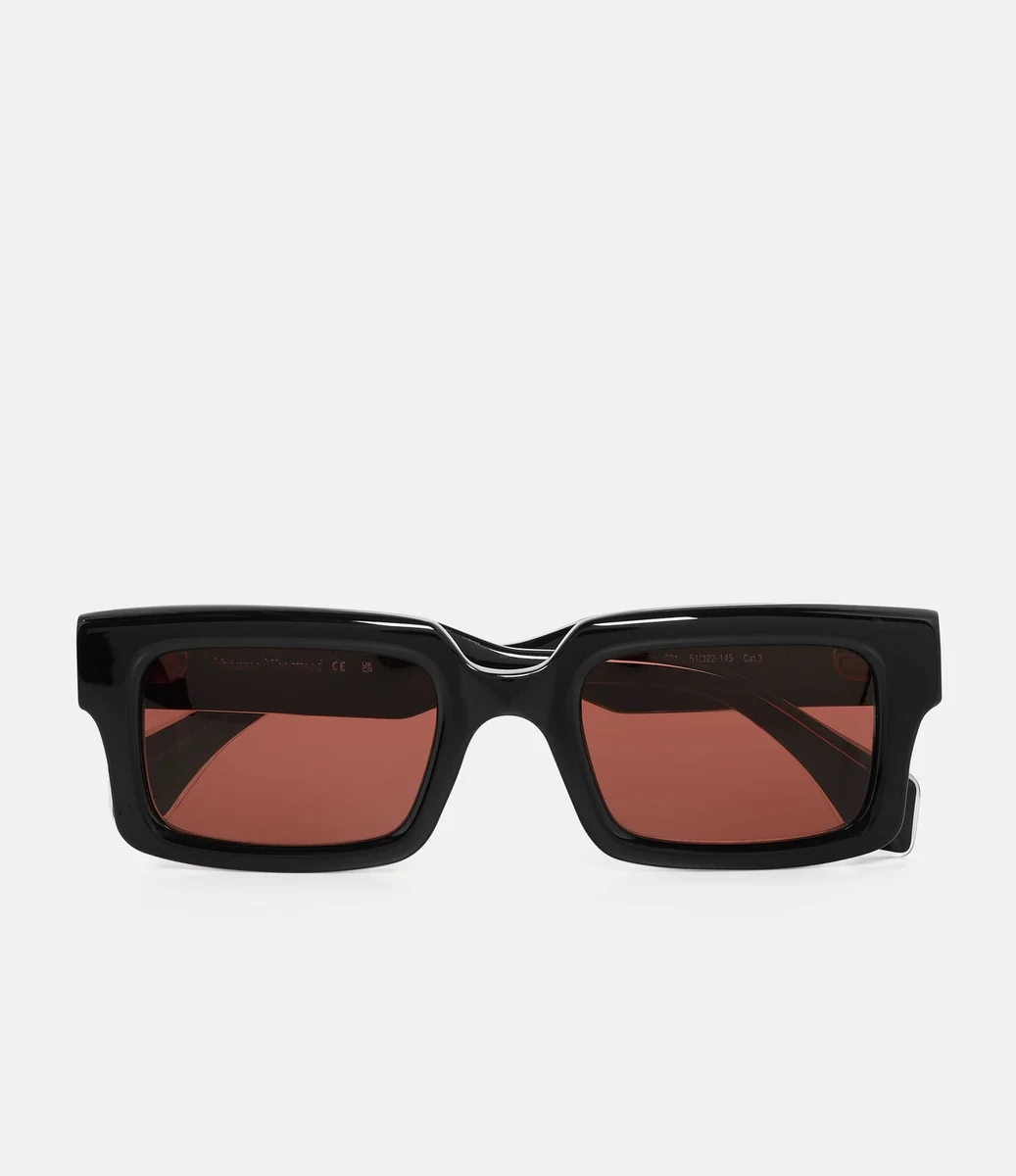 La silhouette des lunettes de soleil Costello, d’un noir brillant, s’inspire des figures culturelles emblématiques de la scène et du grand écran. Dotées d’une monture carrée épaisse et de verres teintés marron, leur design affirmé est rehaussé par des accents en corne complexes qui ornent le bord extérieur, rappelant le bandeau Horn Alice emblématique de Vivienne. Les branches sculptées sont ornées de motifs en forme de globe au niveau des tempes, tandis que les détails métalliques sur mesure sont finis par des gravures miniatures en forme de globe.