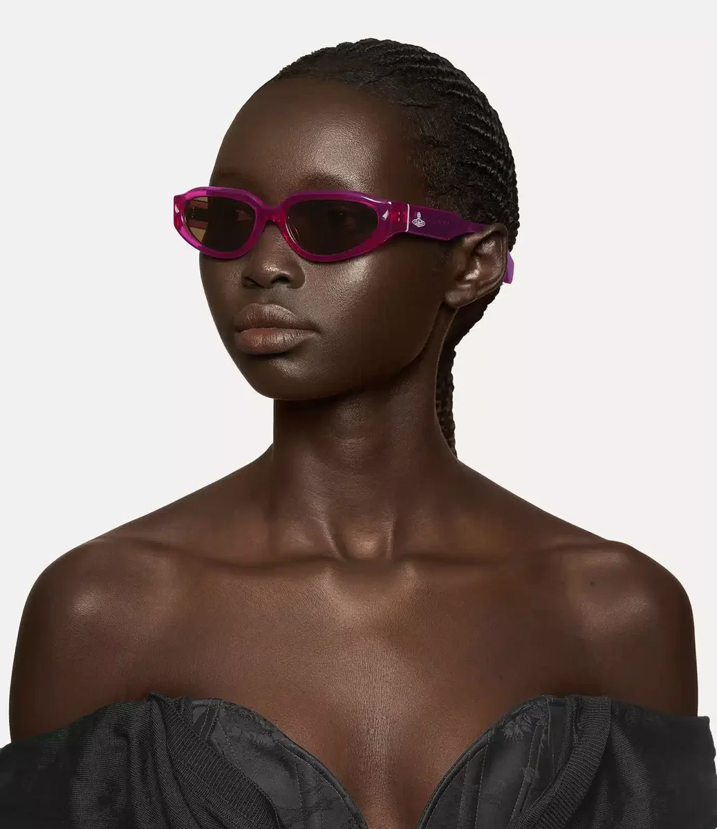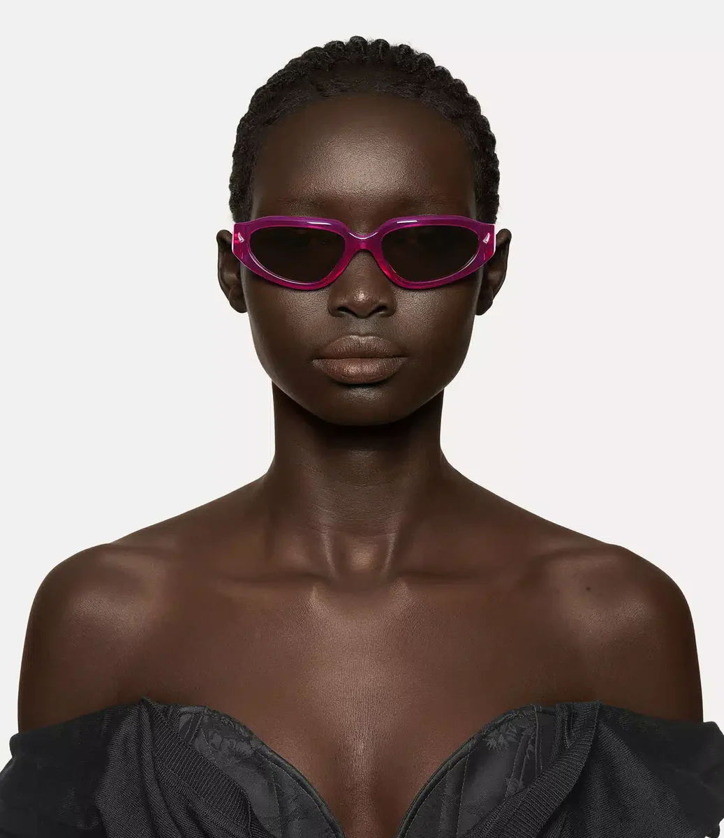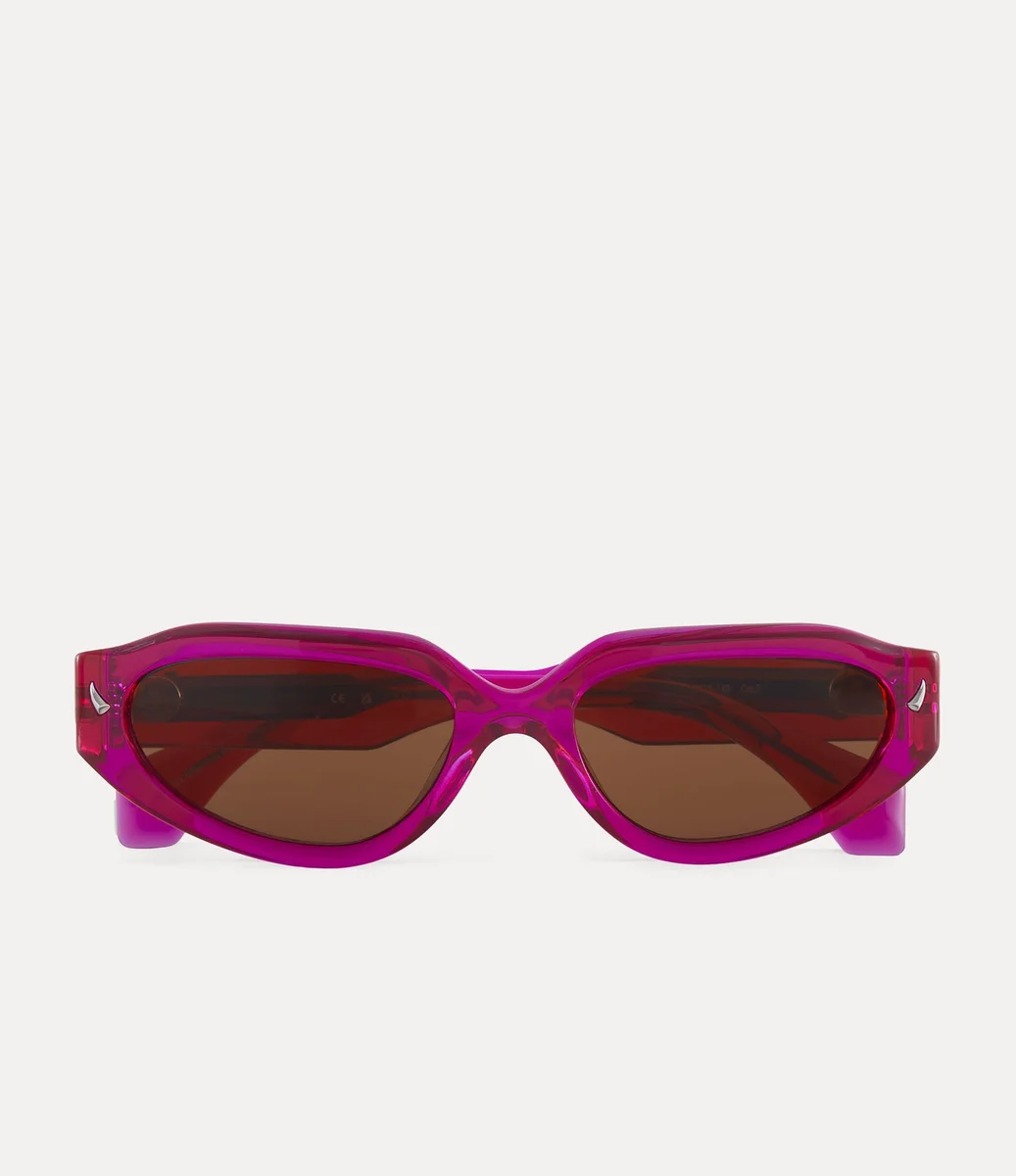 Les lunettes de soleil Grace présentent une silhouette ovale d’inspiration vintage avec des bords légèrement évasés, qui rappellent le glamour du Studio 54. Fabriquées en acétate rose semi-transparent avec des verres bruns, elles sont rehaussées de décorations en forme de corne, qui font écho au bandeau Horn Alice emblématique de Vivienne.