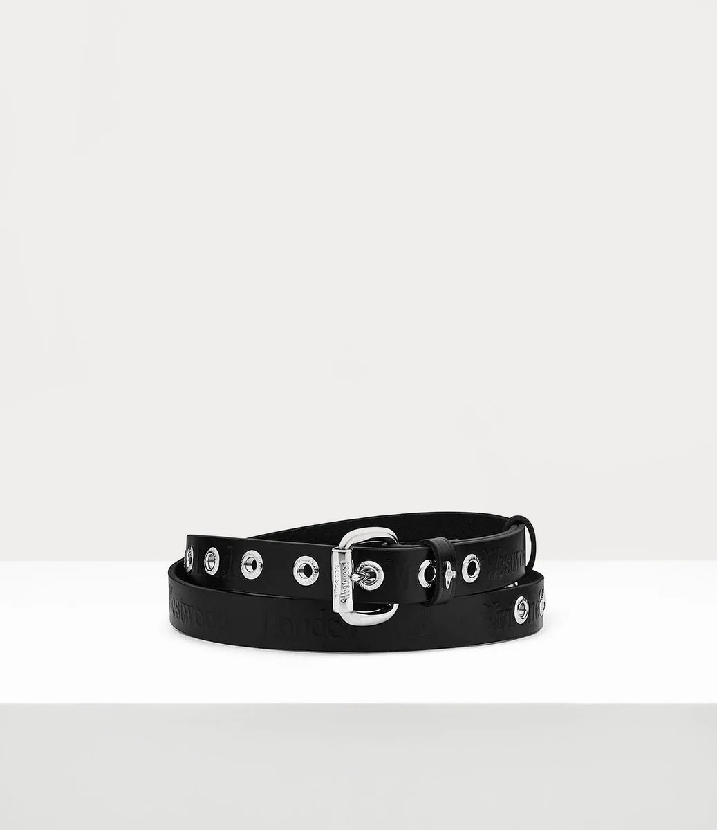 Notre ceinture Carolina présente une silhouette fine en cuir, agrémentée d’œillets en métal poli. Elle est gravée du logo Vivienne Westwood, signature de la maison, rehaussé d’un motif en forme de globe sur la boucle avant, synonyme de la vision de Vivienne qui consiste à propulser la tradition dans le futur.