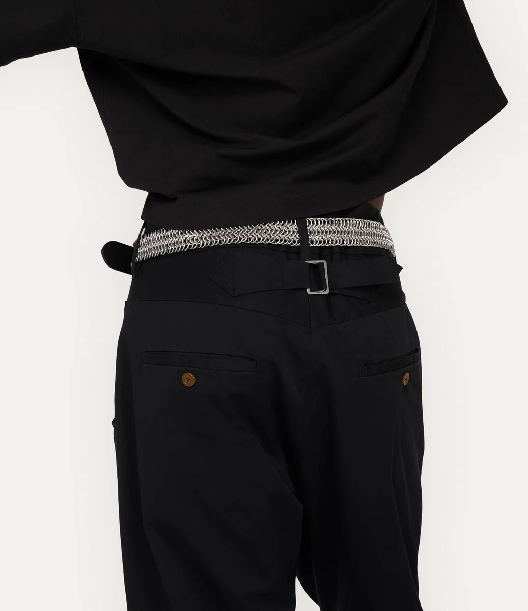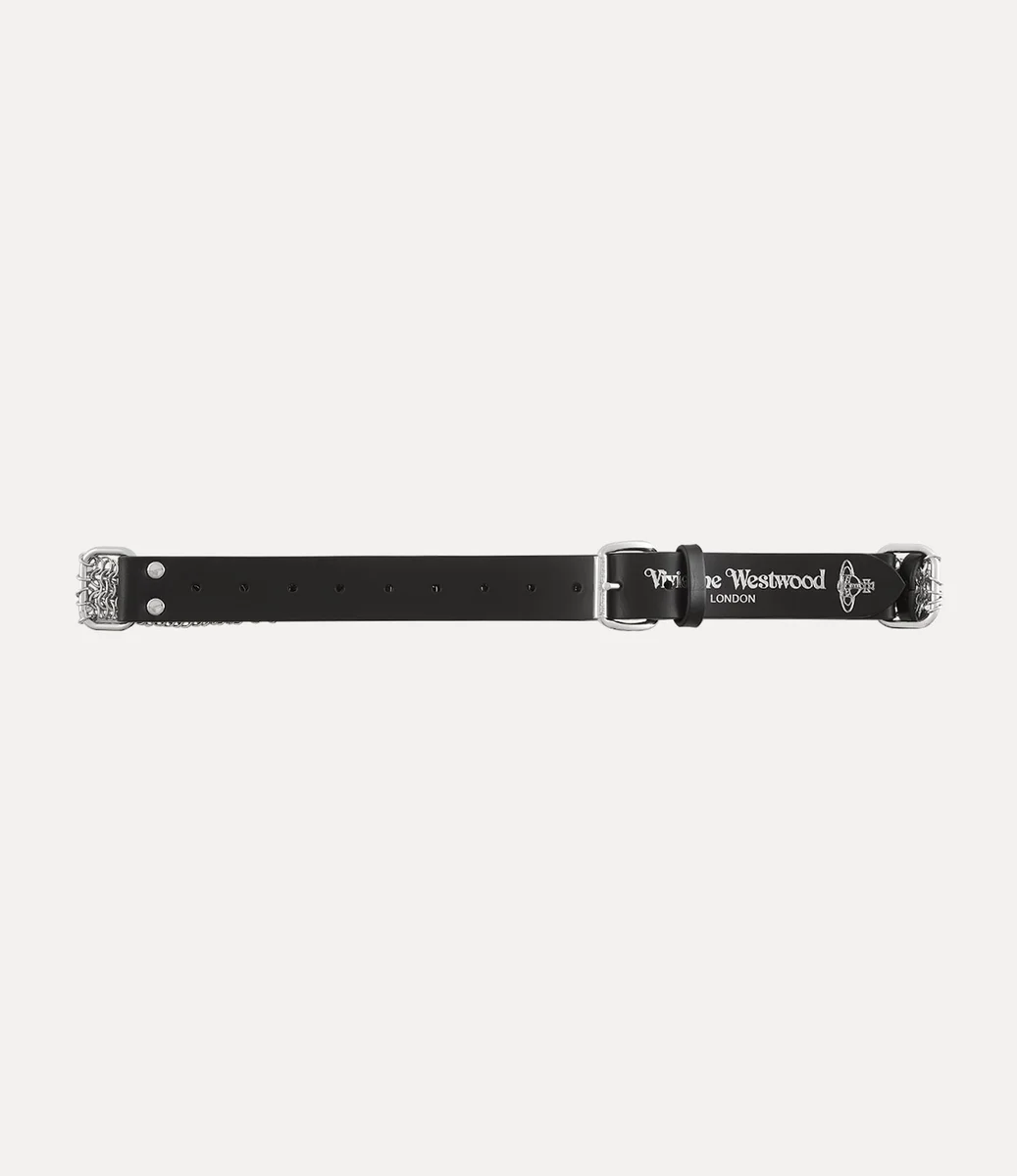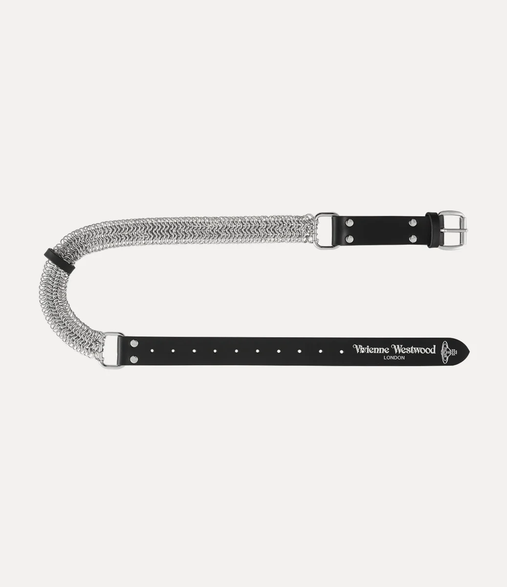 Notre ceinture en cuir à chaîne est une nouvelle version de la ceinture à boucle Roller emblématique de la maison, intégrant des sections de cotte de mailles argentée polie inspirée des armures anciennes, traditionnellement conçues pour draper le corps afin de le protéger. Le profil en cuir lisse est estampé du motif signature « Vivienne Westwood », rehaussé de détails métalliques.