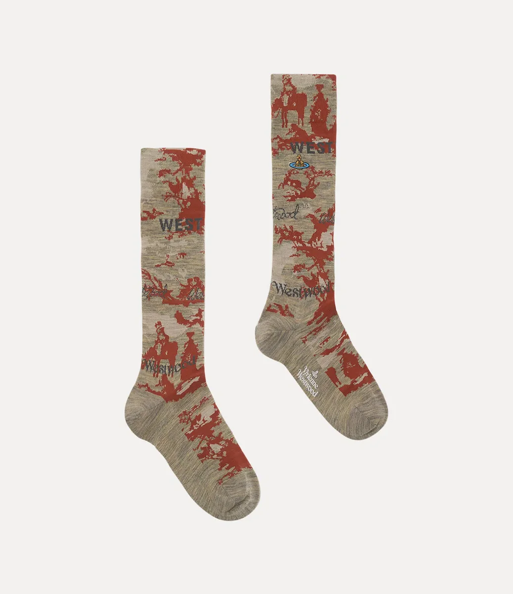 Nos chaussettes longues sont tricotées dans un jacquard Toile de Jouy, qui présente un motif pastoral romantique. Elles sont confectionnées dans un mélange de laine mérinos extra-fine et ornées du motif orb de la maison, brodé de fils multicolores.