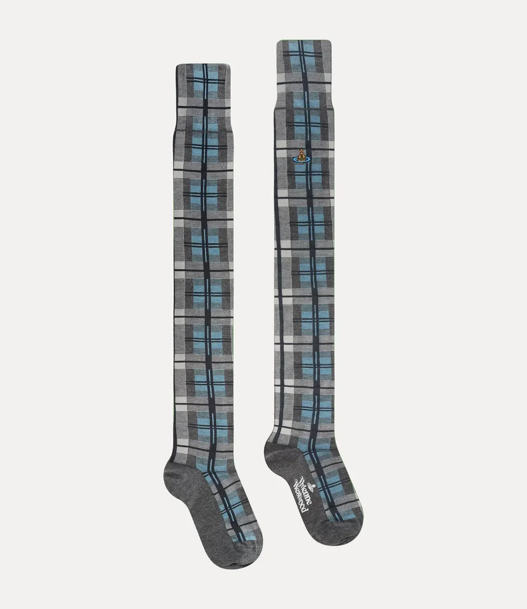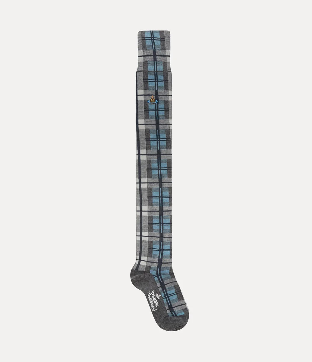 Les chaussettes Over The Knee arborent le tartan « Moonshine » très tendance cette saison et sont confectionnées dans un mélange de laine mérinos extra-fine. Elles sont ornées du motif orb de la maison brodé de fils multicolores, qui symbolise la tradition, entouré des anneaux célestes de Saturne, symbolisant l’avenir.