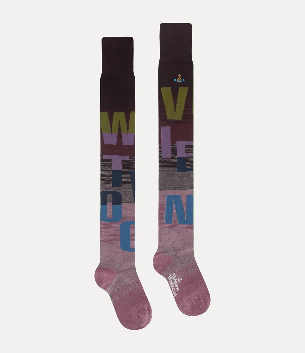 Les chaussettes Over The Knee arborent le jacquard « Logomania » très tendance cette saison et sont confectionnées dans un mélange de laine mérinos extra-fine. Elles sont ornées du motif orb de la maison brodé de fils multicolores, qui symbolise la tradition, entouré des anneaux célestes de Saturne, symbolisant l’avenir.