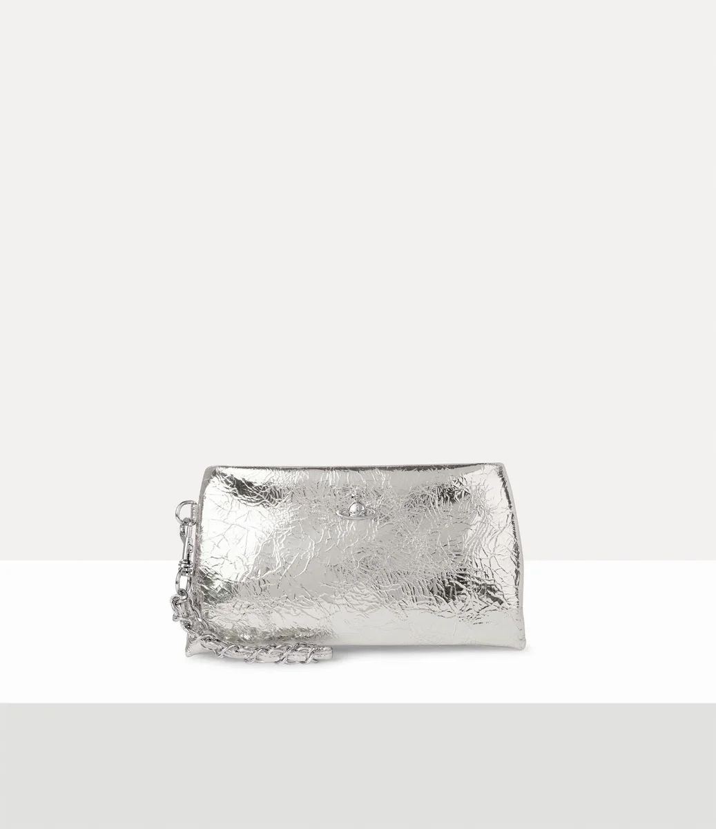 La pochette Sadie a été réinventée dans un cuir métallisé à effet froissé, inspiré des riches archives de la maison. Le design se caractérise par une chaîne argentée entrelacée de détails en cuir ton sur ton, rehaussée d’un motif sphérique poli à l’avant, symbole de la vision de Vivienne qui consiste à propulser la tradition vers l’avenir.