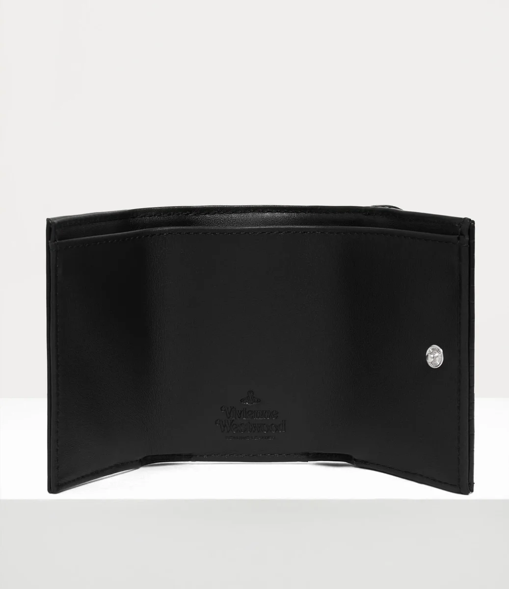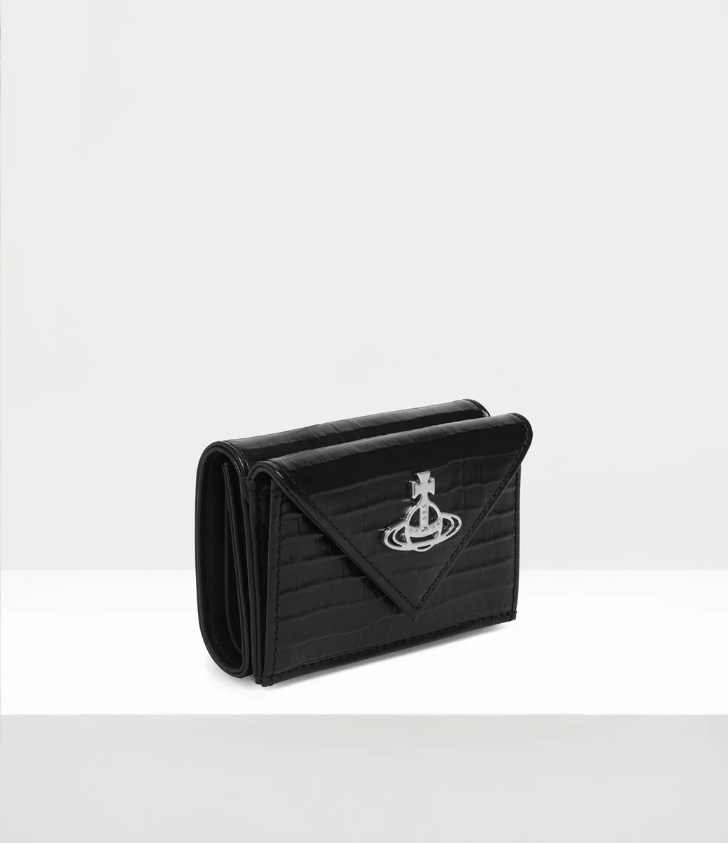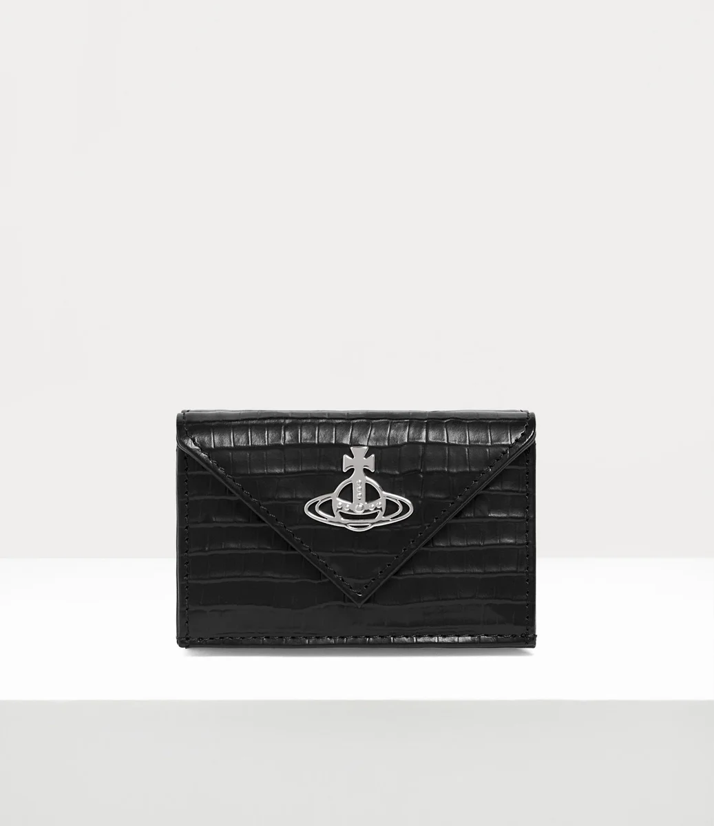 Le portefeuille enveloppe Vivienne Westwood est revisité dans le cuir gaufré effet mini croco de cette saison, avec un motif « Line Orb » sur le devant.