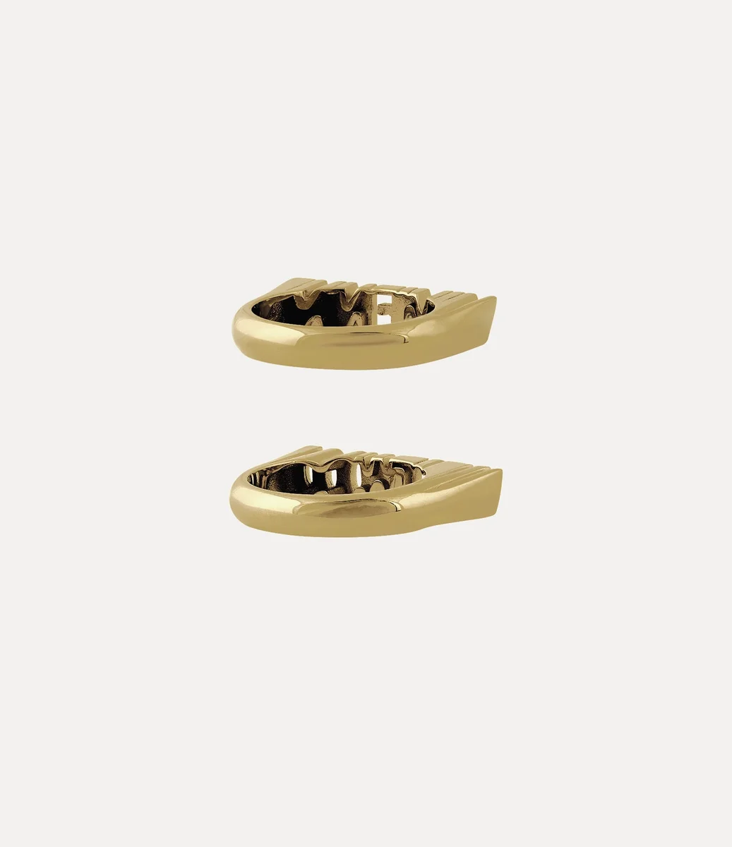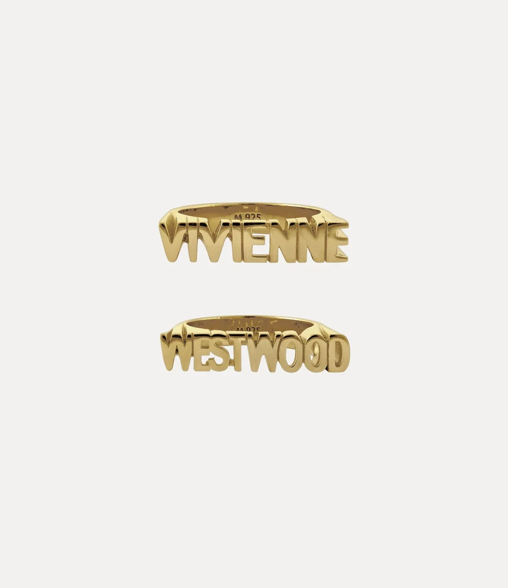Notre bague Essex est fabriquée à partir d’argent recyclé et finie avec un placage doré poli. Composée de deux bandes métalliques audacieuses, l’une épelant « Vivienne » et l’autre « Westwood », son design est rehaussé par des détails découpés complexes qui épousent les contours de chaque lettre.