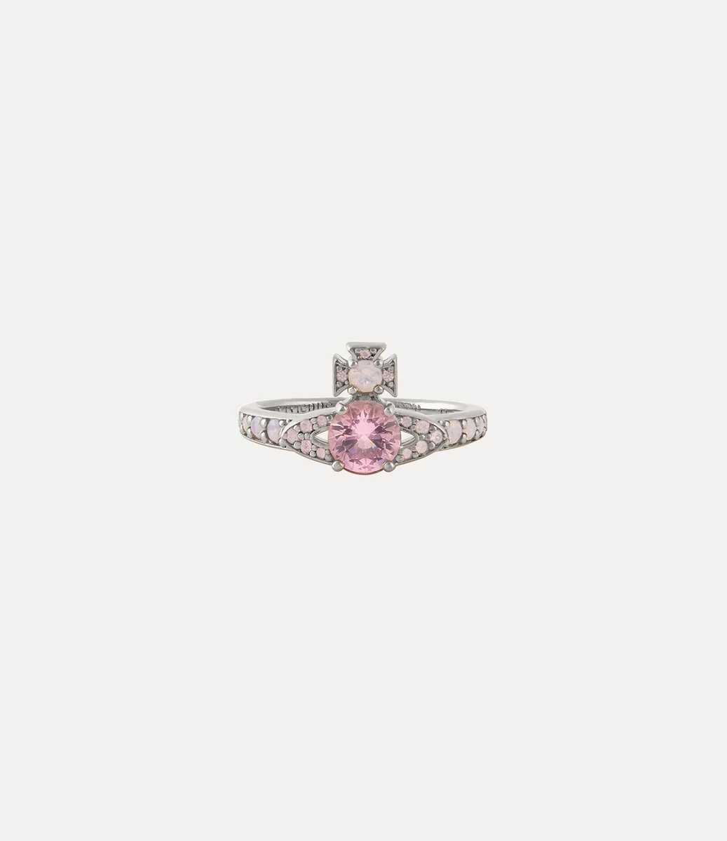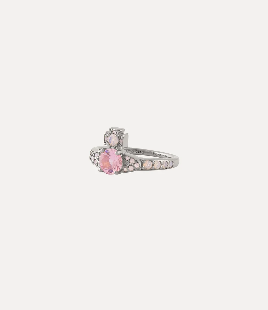 La bague Ismene est proposée cette saison en argent recyclé, avec une finition polie couleur platine et un anneau fin incrusté de cristaux. Elle est ornée d’un cristal rose scintillant au centre de la face en forme de globe, qui symbolise la tradition, entouré des anneaux célestes de Saturne, représentant l’avenir.