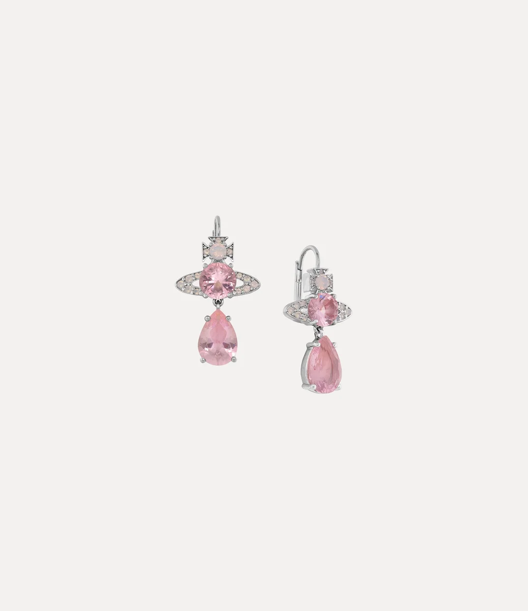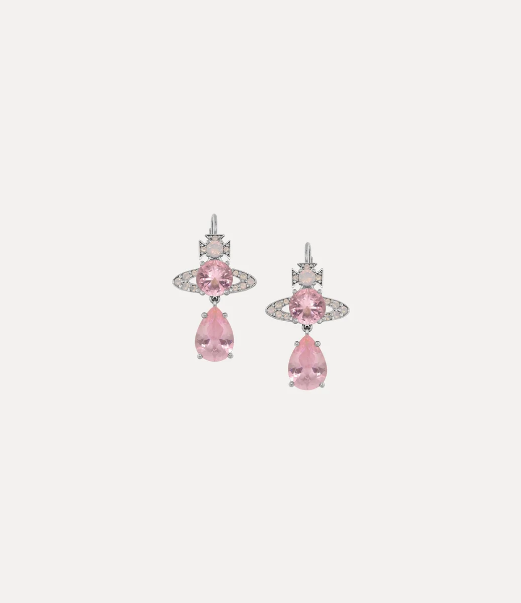 Nos boucles d’oreilles Ismene Drop sont fabriquées en métal argenté, avec une pierre précieuse rose facettée au centre de chaque globe et une pierre en forme de larme suspendue en dessous. La bague Saturne est ornée de délicats cristaux roses, tandis que la croix au sommet est décorée d’une pierre précieuse laiteuse et irisée.