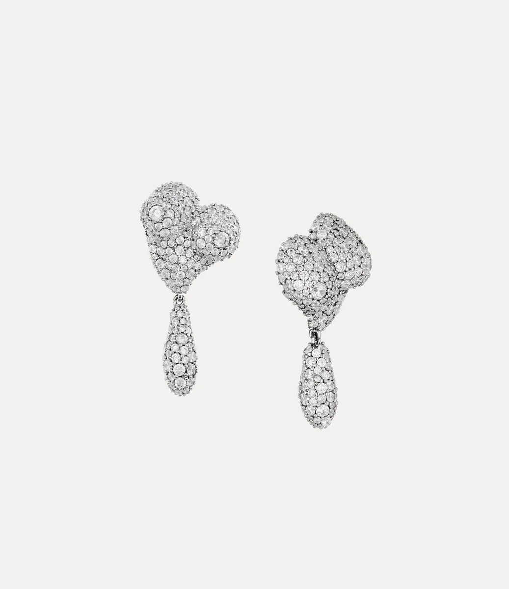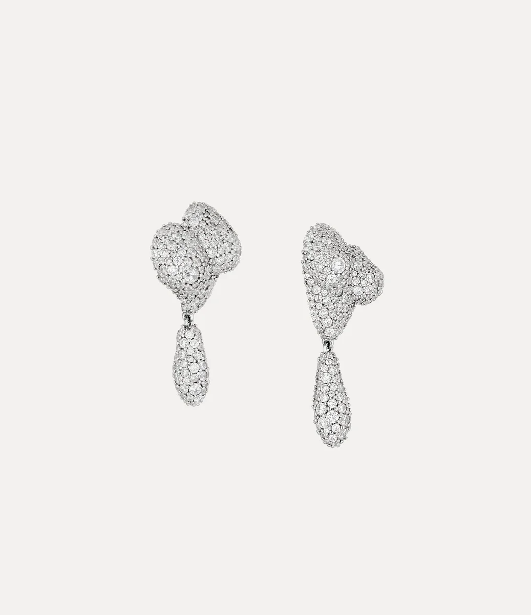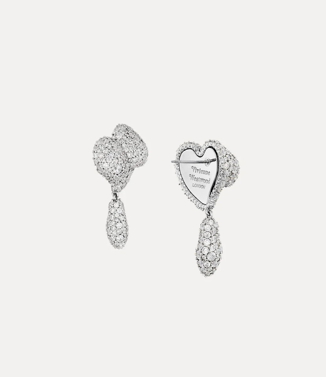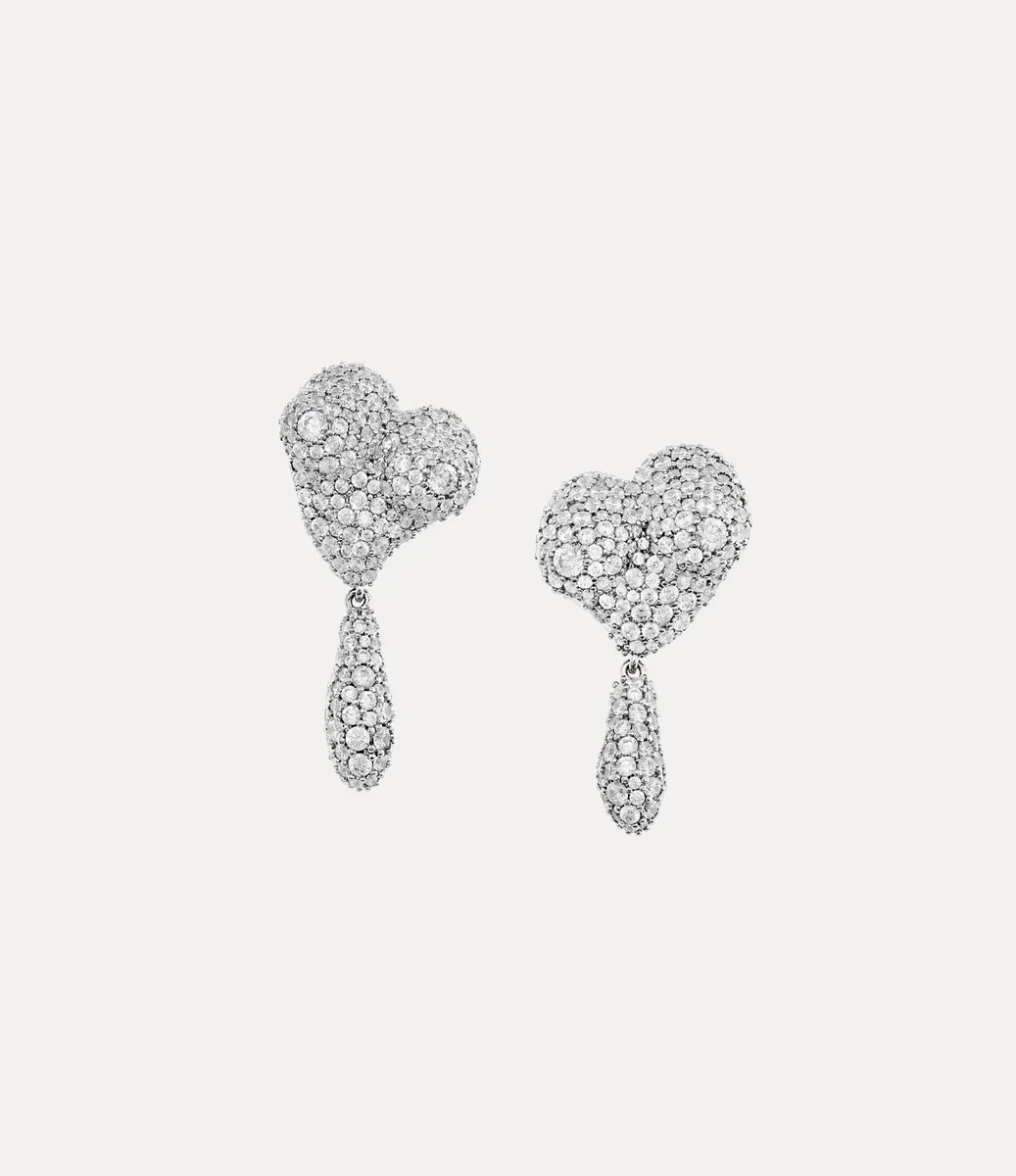 Nos boucles d’oreilles Mimosa Pave reprennent le motif asymétrique en forme de cœur classique de la maison, rappelant l’affection de Vivienne pour l’humanité et la planète. Incrustées de détails en cristal ton sur ton, elles sont délicatement sculptées en pointe effilée et complétées par une goutte pendante.