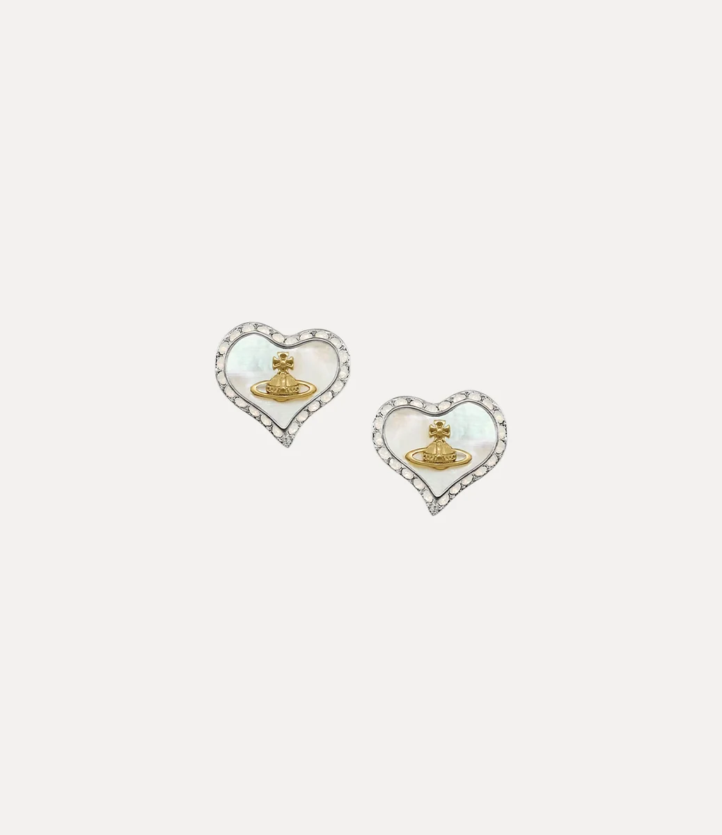 La forme asymétrique en cœur est devenue un style emblématique de la maison, que Vivienne utilisait pour évoquer son affection pour l’humanité et la planète. Nos boucles d’oreilles Petra adoptent une silhouette en cœur, ornée de cristaux blancs et d’un motif sphérique doré contrastant, synonyme de la philosophie de la maison qui consiste à propulser le passé vers l’avenir.