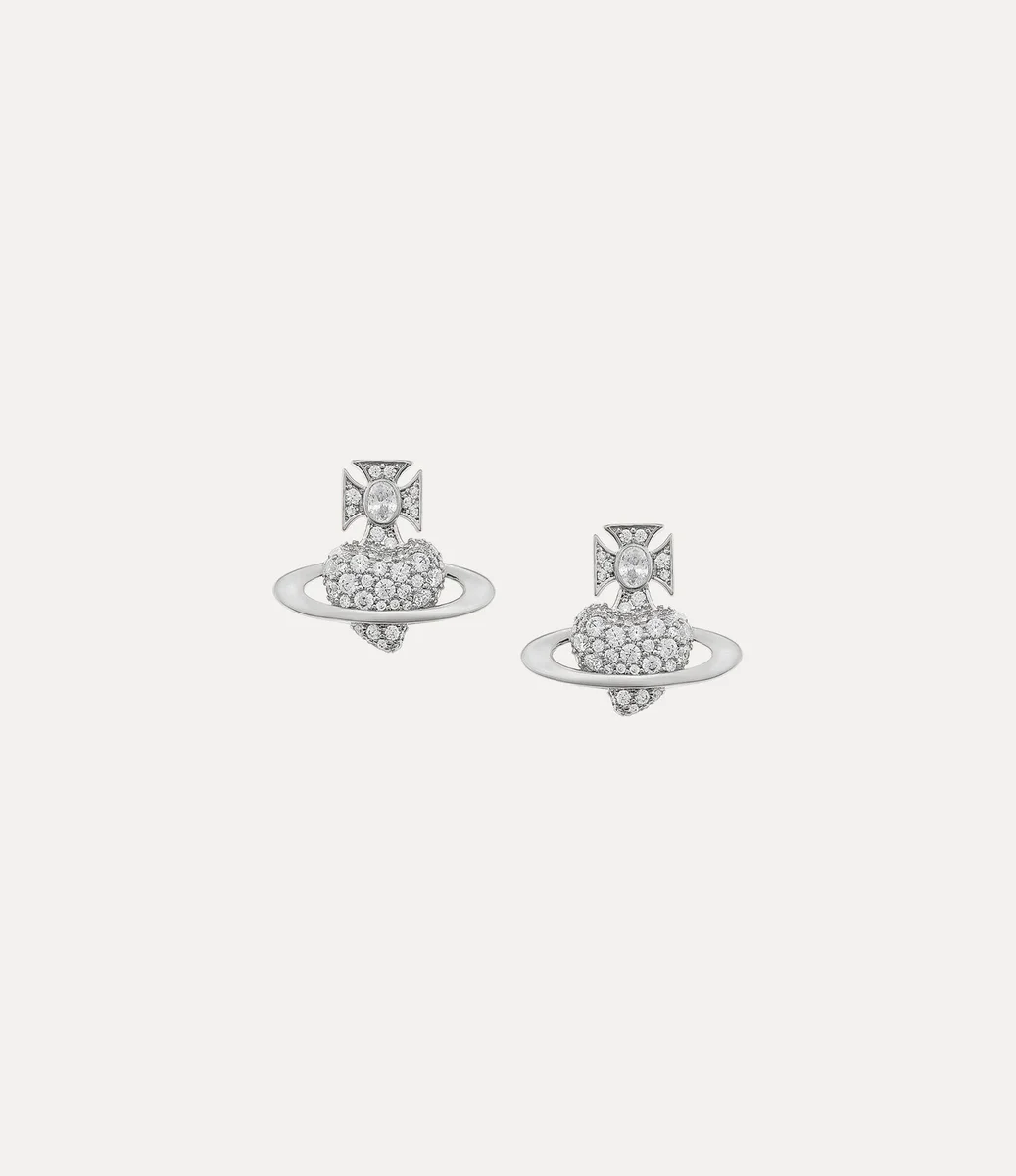 Les boucles d’oreilles Valentine’s Agnatha présentent une silhouette asymétrique en forme de cœur, symbole de l’affection de Vivienne pour l’humanité et la planète. La pièce est décorée de cristaux scintillants dans des tons blancs, ornée d’un placage argenté poli et finie avec des détails en émail blanc peint à la main à l’intérieur de l’anneau céleste de Saturne.