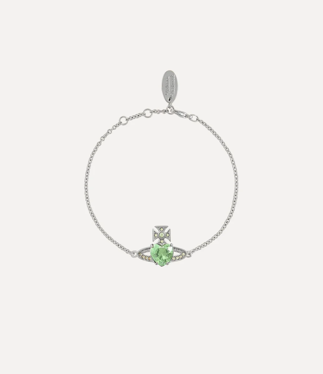Symbole de l’amour de Vivienne pour l’humanité et la planète, le bracelet Ariella est orné d’un cristal vert clair en forme de cœur en son centre. Réalisé en plaqué argent poli, il est rehaussé d’une plaque ovale gravée au niveau du fermoir mousqueton.