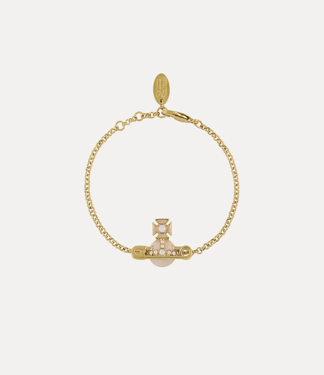 Notre bracelet Kitty est revisité cette saison avec un placage doré poli et des détails métalliques classiques. Le motif central en forme de globe est rehaussé d’émail translucide peint à la main et percé d’un motif classique en forme d’épingle de sûreté, clin d’œil à l’esthétique punk caractéristique de Vivienne.