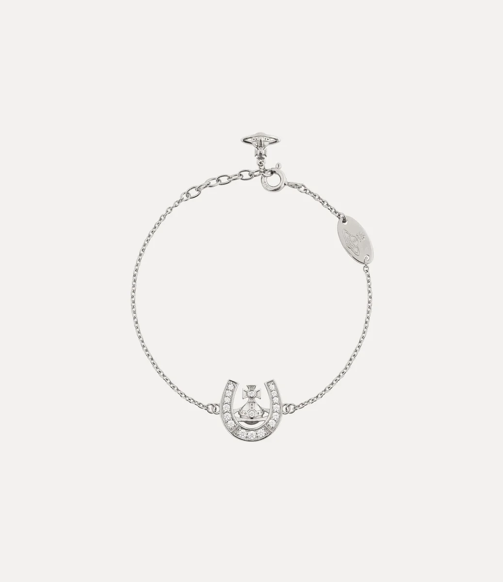 Notre bracelet Mare fait revivre l’iconographie emblématique de la maison, ornée de symboles de chance et de protection. Incrusté de cristaux ton sur ton scintillants, ce bijou présente un motif central en forme de fer à cheval avec un globe plaqué platine en son centre, et est rehaussé d’un délicat globe suspendu au fermoir mousqueton.