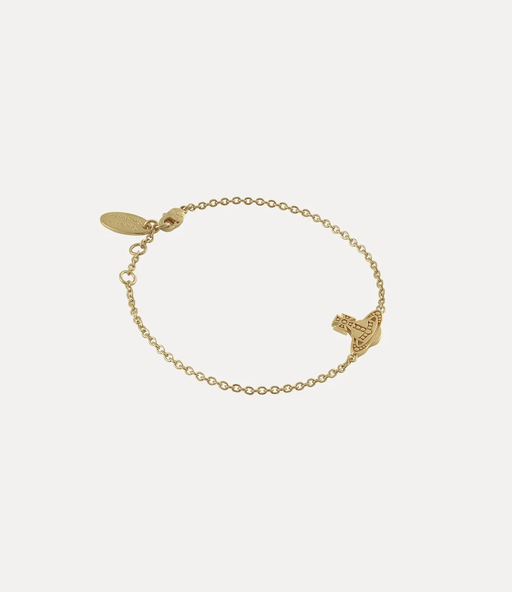 Notre bracelet Marinetta est fabriqué en métal doré et orné au centre du motif orbulaire emblématique de la maison. Son design présente une texture légèrement pressée, semblable à des perles, qui lui confère un aspect artisanal, tandis que les détails gravés accentuent les contours de la croix et de l’anneau Saturne.