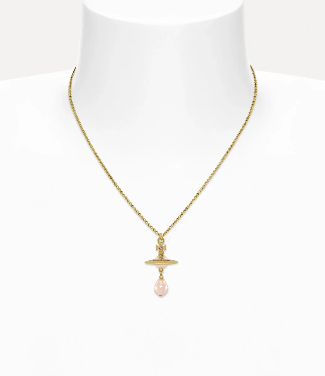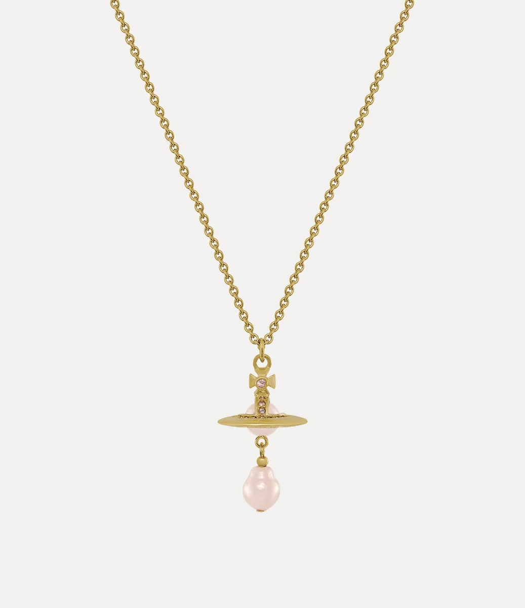 Le collier pendentif Aleksa revisite le motif classique de la sphère en trois dimensions, incarnant la philosophie qui consiste à propulser le passé vers l’avenir. Le pendentif est orné de cristaux scintillants et se termine par une perle baroque en verre, le tout recouvert d’un placage doré poli.