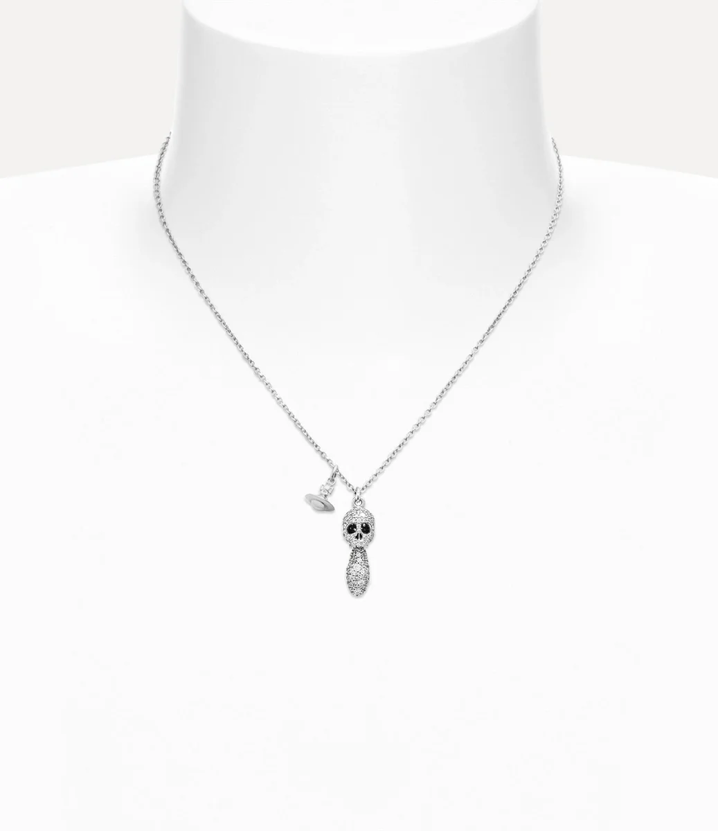 Notre collier pendentif Circe Orb présente un motif central en forme de crâne, motif traditionnel de la maison, orné de rangées de pierres précieuses scintillantes. Agrémenté d’une goutte de cristal en forme de larme, ce bijou est doté d’un globe métallique suspendu, rappelant la vision de Vivienne qui consiste à propulser la tradition dans le futur.