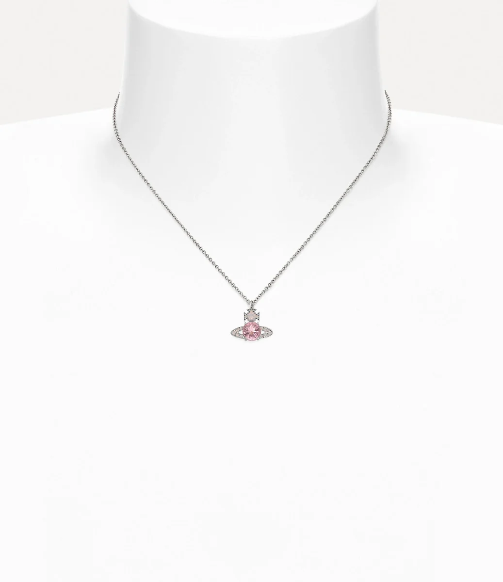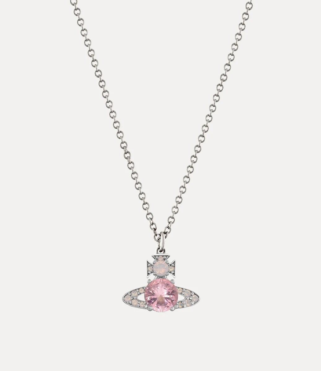 Notre collier pendentif Ismene est proposé cette saison dans un placage argenté poli. Le design présente des détails en cristal rose scintillant, un fermoir mousqueton et un motif sphérique embelli au centre, reflétant la vision de Vivienne qui consiste à propulser la tradition dans le futur.