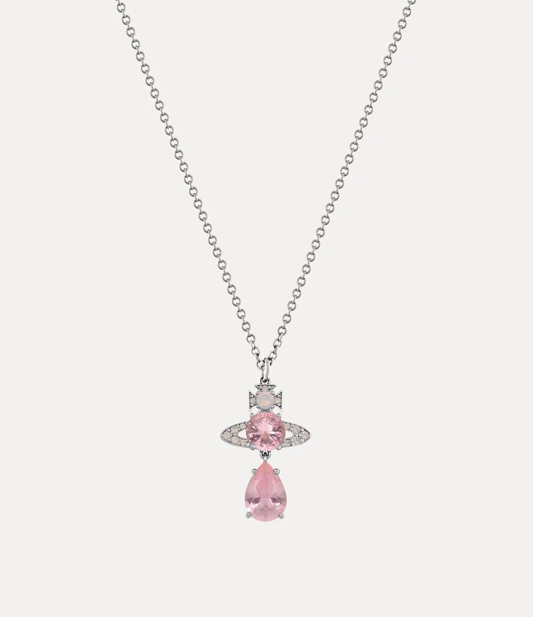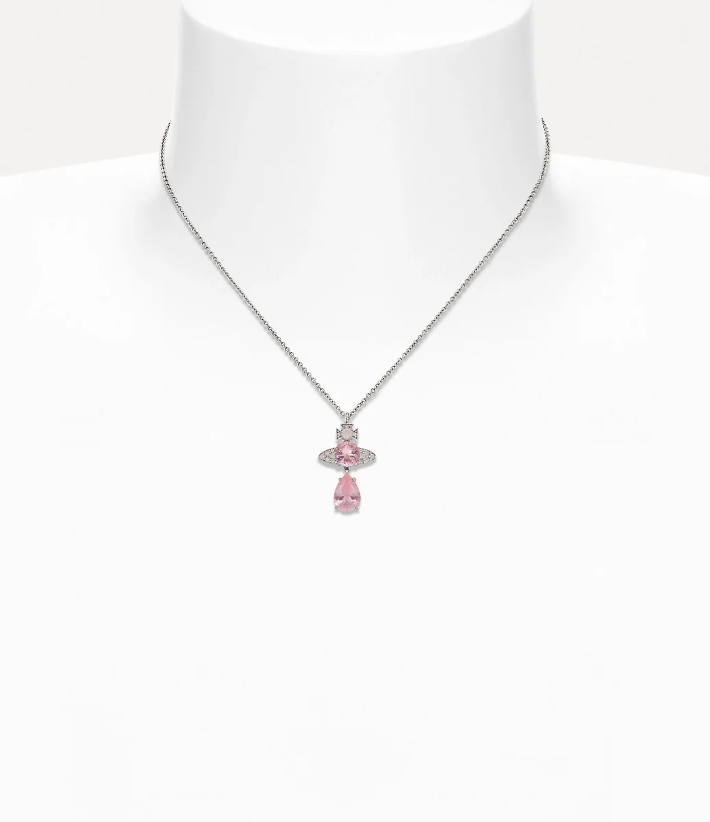 Le collier pendentif Ismene Drop de Vivienne Westwood se caractérise par une sphère rose bidimensionnelle distinctive au centre, agrémentée d’une pierre précieuse en forme de poire et de cristaux ton sur ton scintillants.
