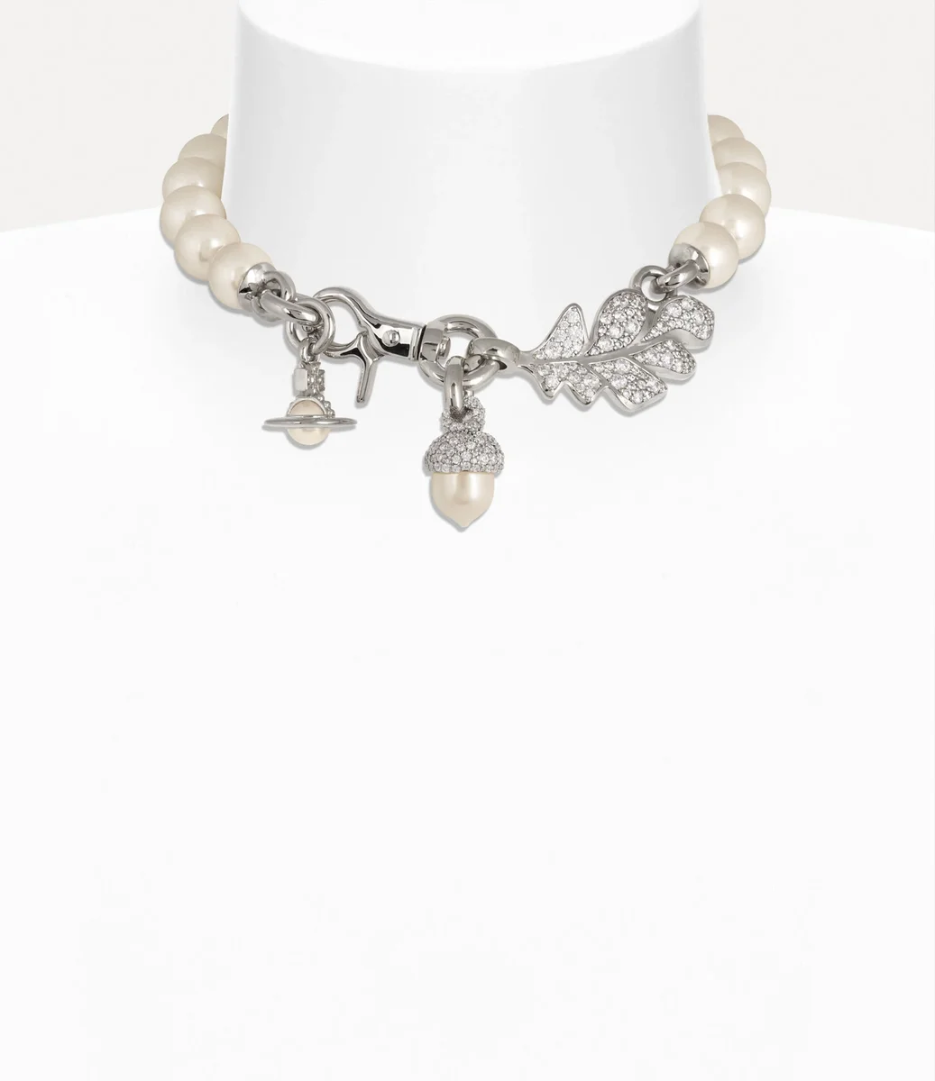 Le grand collier Lucille est orné d’une rangée de perles Swarovski surdimensionnées à base de verre, rehaussées des motifs emblématiques de la maison, le gland et la feuille. Rehaussé de pavés, ce bijou est doté d’un fermoir mousqueton pivotant, auquel est suspendu un globe élégant.