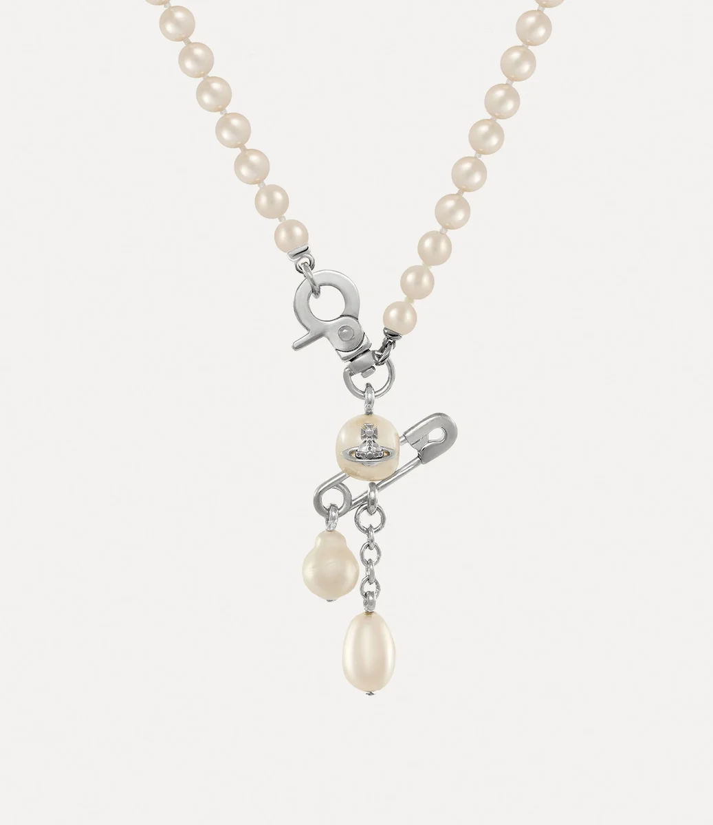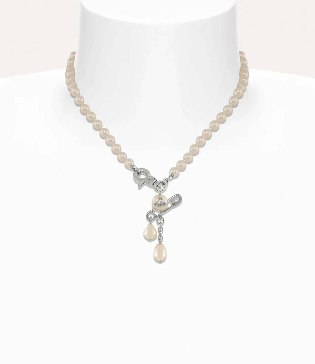 Le collier Small Claude Pearl, issu des archives, a été revisité cette saison avec une rangée unique de perles en verre Swarovski scintillantes, offrant un détail de perles arrondies au centre, complété par une épingle de sûreté classique traversant le motif, évoquant l’esthétique punk caractéristique de Vivienne.