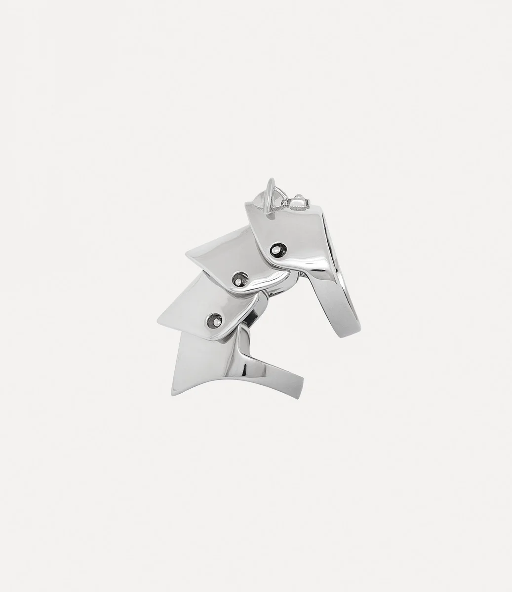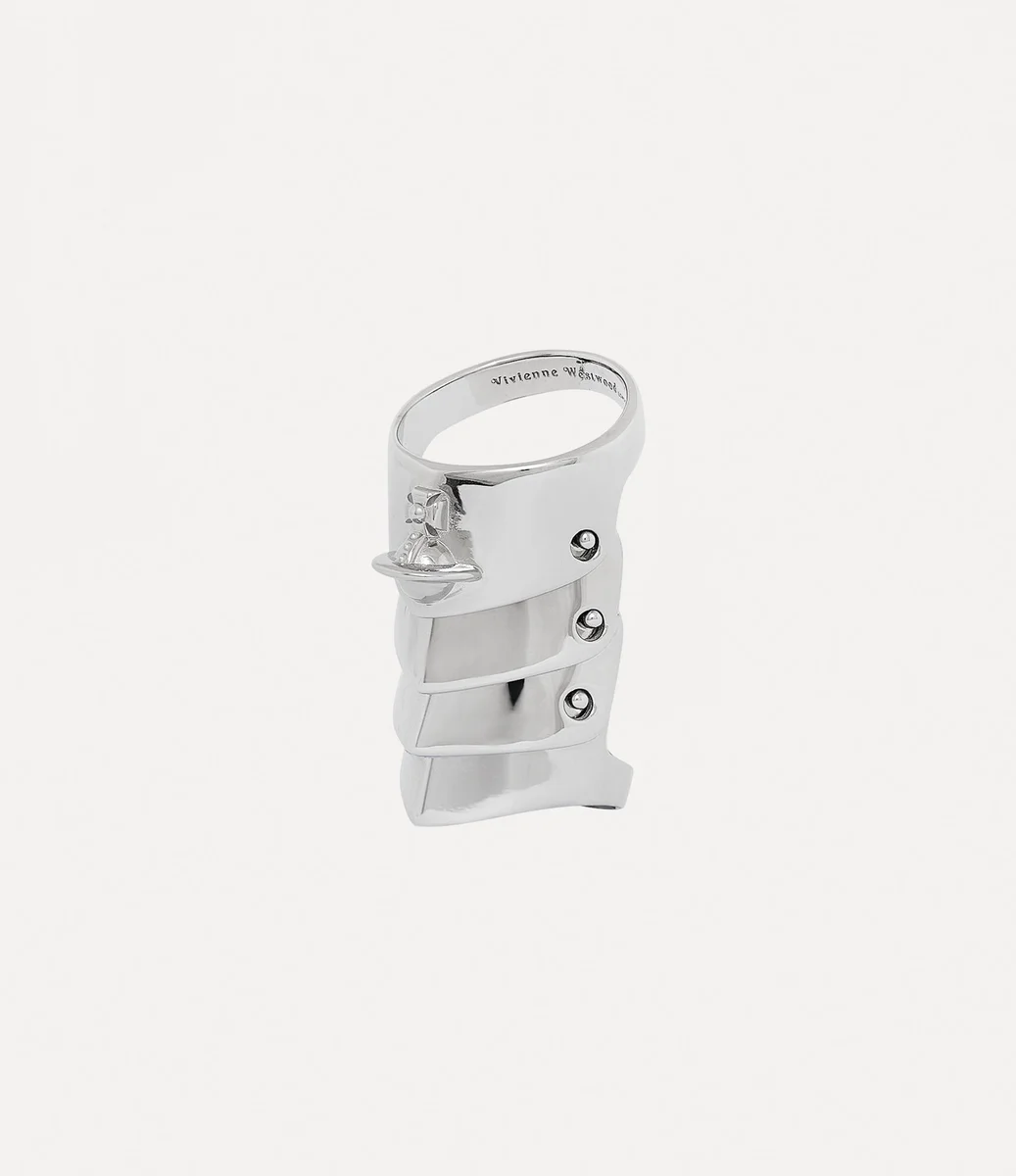 La silhouette de la bague Armour s’inspire des vestes plaquées inspirées des armures de la collection « Time Machine » de Vivienne Westwood de 1988, reflétant la profonde fascination de Vivienne pour la Wallace Collection. La pièce se compose de quatre sections en argent plaqué platine qui se chevauchent, ornées de notre motif orbulaire signature, incarnant la philosophie qui consiste à emporter le passé dans le futur.
