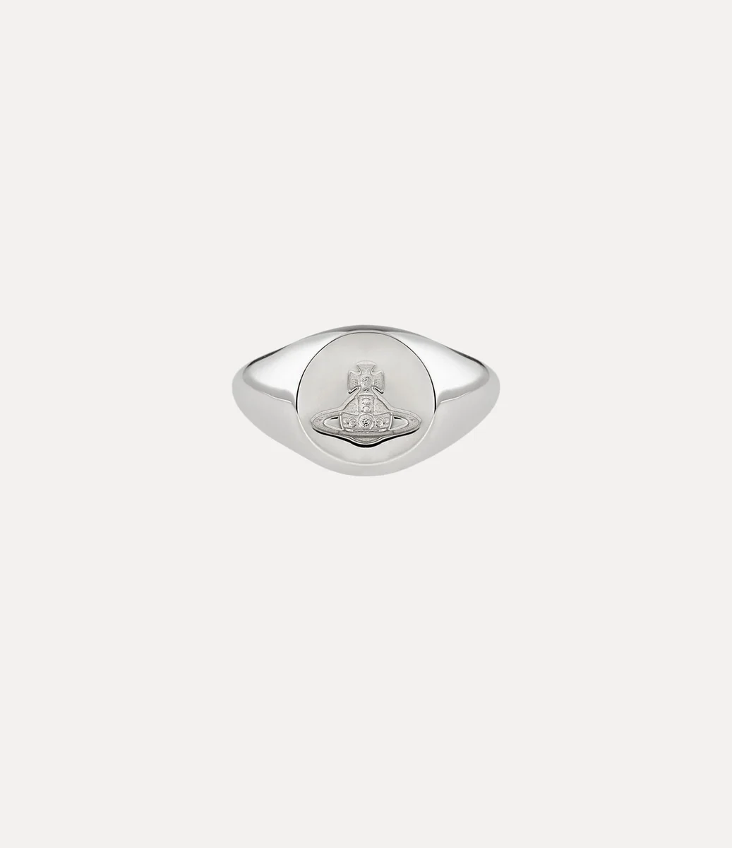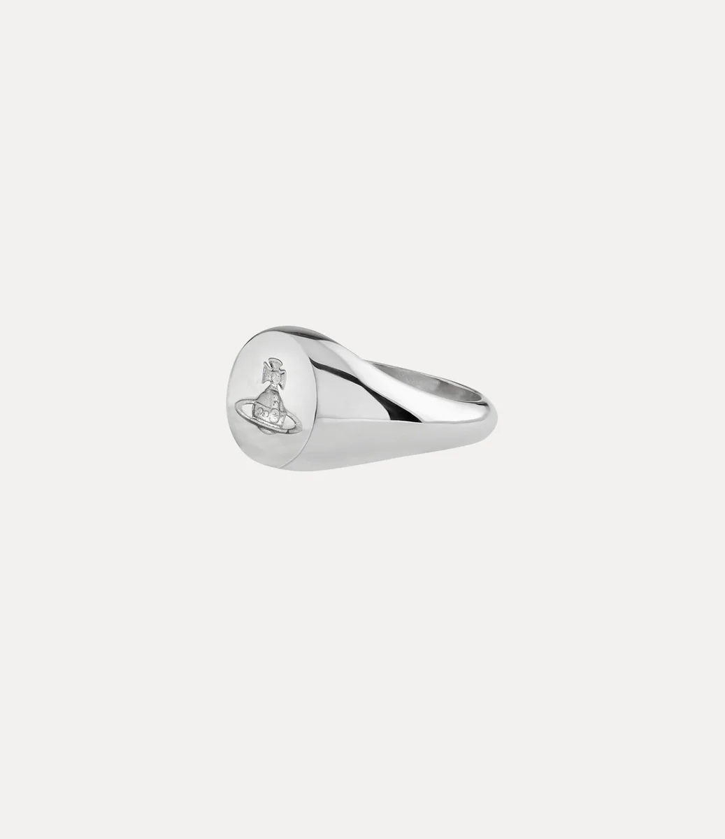 Notre bague Sigillo est de style classique, avec un globe gravé en creux sur la face circulaire, rappelant la vision de Vivienne Westwood qui consiste à propulser la tradition dans le futur. L’intérieur de l’anneau est finement gravé de détails texturés, complétés par une élégante finition plaquée platine.