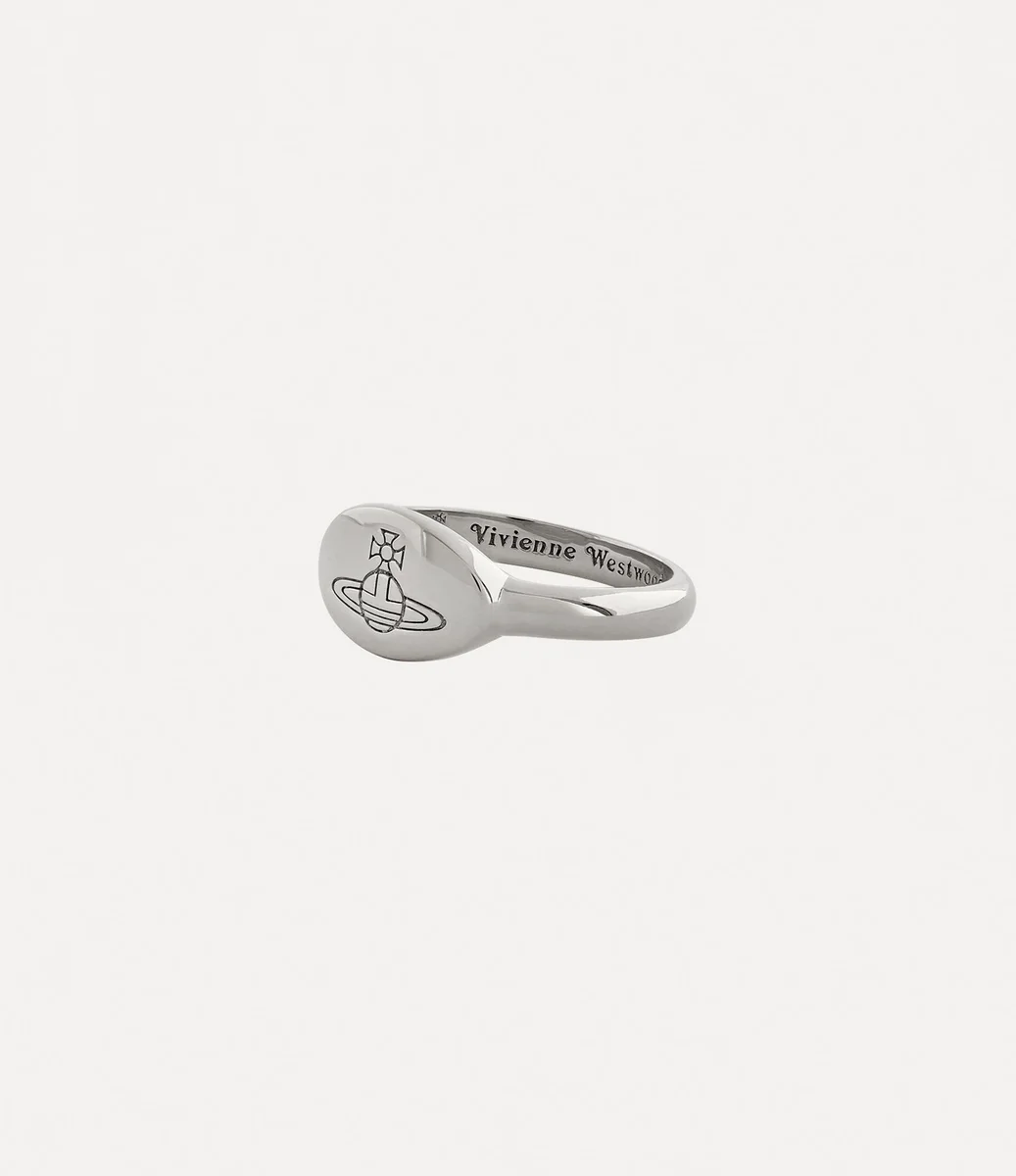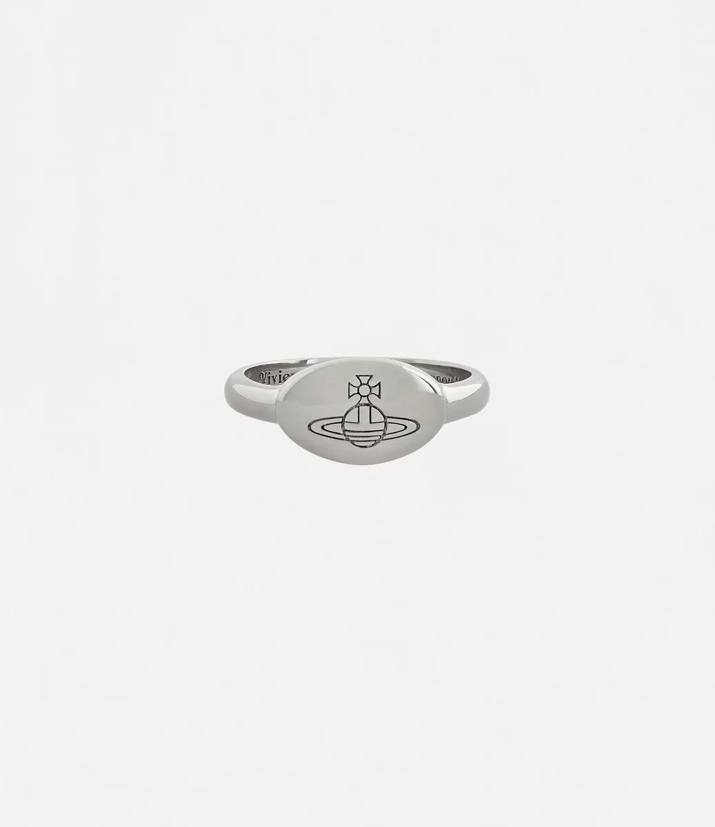 Notre bague Tilly présente une silhouette classique en forme de chevalière, fabriquée en argent recyclé et finie avec un placage poli de couleur platine. En son centre, le motif orb gravé est peint à la main avec des détails en émail noir, faisant écho à la vision de Vivienne qui consiste à propulser la tradition dans le futur.