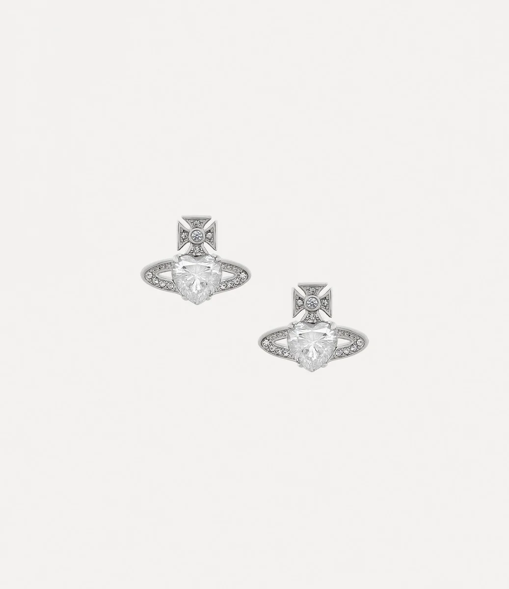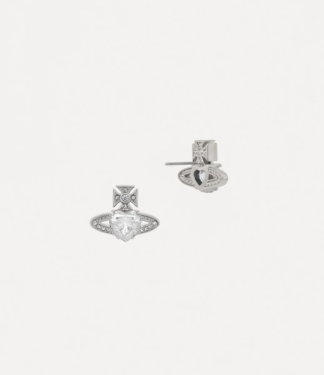 Les boucles d’oreilles Ariella argentées sont ornées d’un cristal en forme de cœur au centre, rappelant l’affection de Vivienne pour l’humanité et la planète, tandis que l’anneau de Saturne l’entoure comme un symbole d’avenir. La pièce est délicatement finie avec des ornements en cristal blanc, complétés par un placage argenté poli.