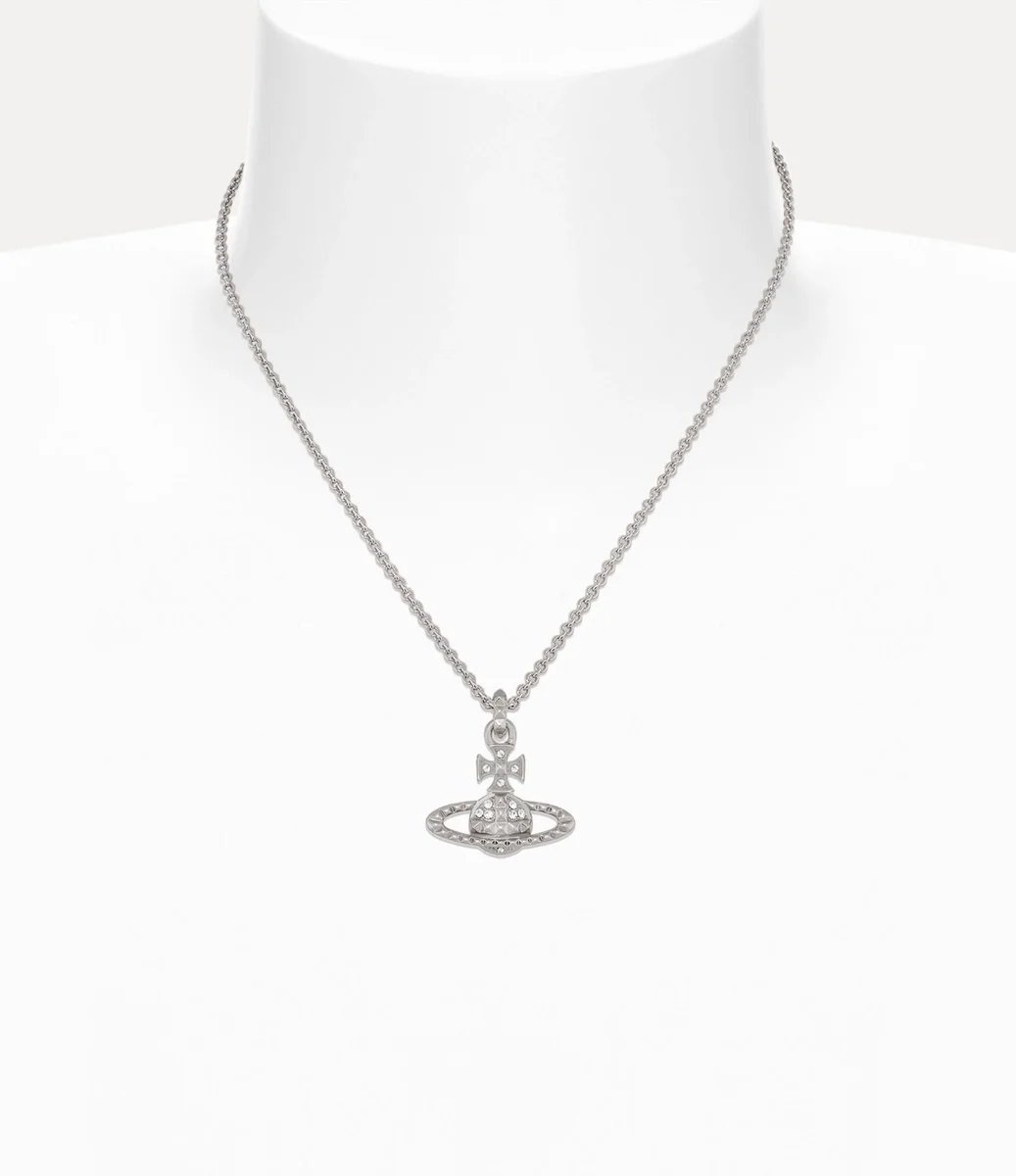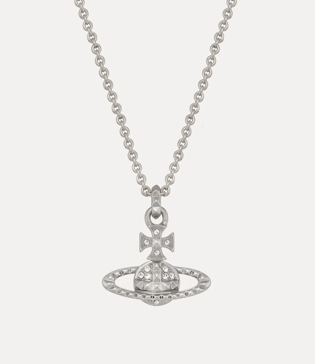 Le collier Mayfair Bas Relief Pendant revient cette saison avec un placage argenté et des cristaux scintillants. La pièce présente une silhouette en forme de globe, synonyme de la vision de la maison qui consiste à propulser la tradition dans le futur, et est agrémentée de détails cloutés, symboles de non-conformisme, dans la lignée de l’approche punk caractéristique de Vivienne.