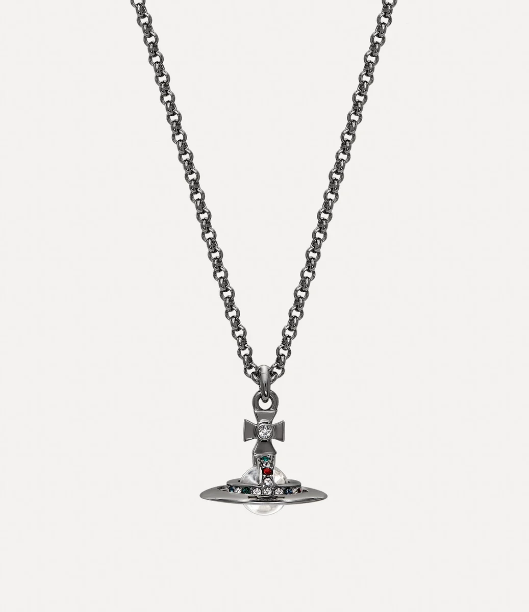 Notre nouveau collier pendentif Petite Orb a été revisité cette saison avec un placage couleur bronze. Incrusté de cristaux rouges, émeraude et blancs scintillants, le design intègre notre boule tridimensionnelle emblématique au centre de la chaîne, synonyme de la vision de Vivienne qui consiste à propulser la tradition dans le futur.