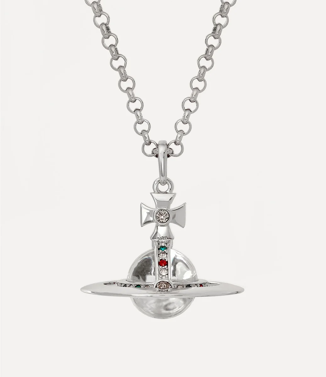 Notre nouveau collier pendentif Small Orb présente un globe tridimensionnel distinctif avec une boule de verre transparente en son centre, inspiré du motif iconique en forme de globe de la maison, rappelant la vision de Vivienne qui consiste à allier tradition et futur. Incrusté d’une multitude de cristaux multicolores, le collier est complété par une étiquette en relief au niveau de l’attache.