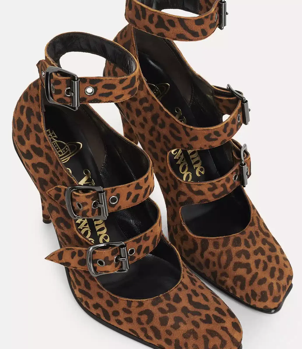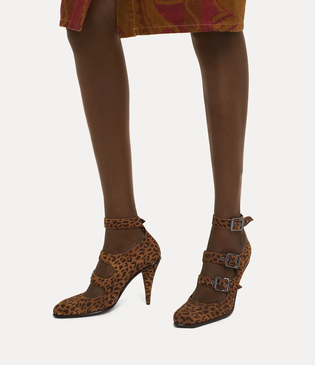 Nos escarpins Savage présentent une silhouette anatomique inspirée du motif « Animal Toe » emblématique de la maison, introduit pour la première fois dans la collection printemps-été 2000, « Summertime ». Confectionnés en cuir, ils sont imprimés d’un motif léopard vintage en daim et rehaussés de détails métalliques couleur bronze.