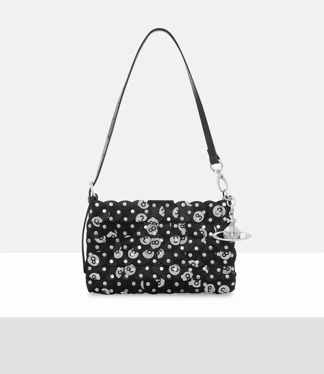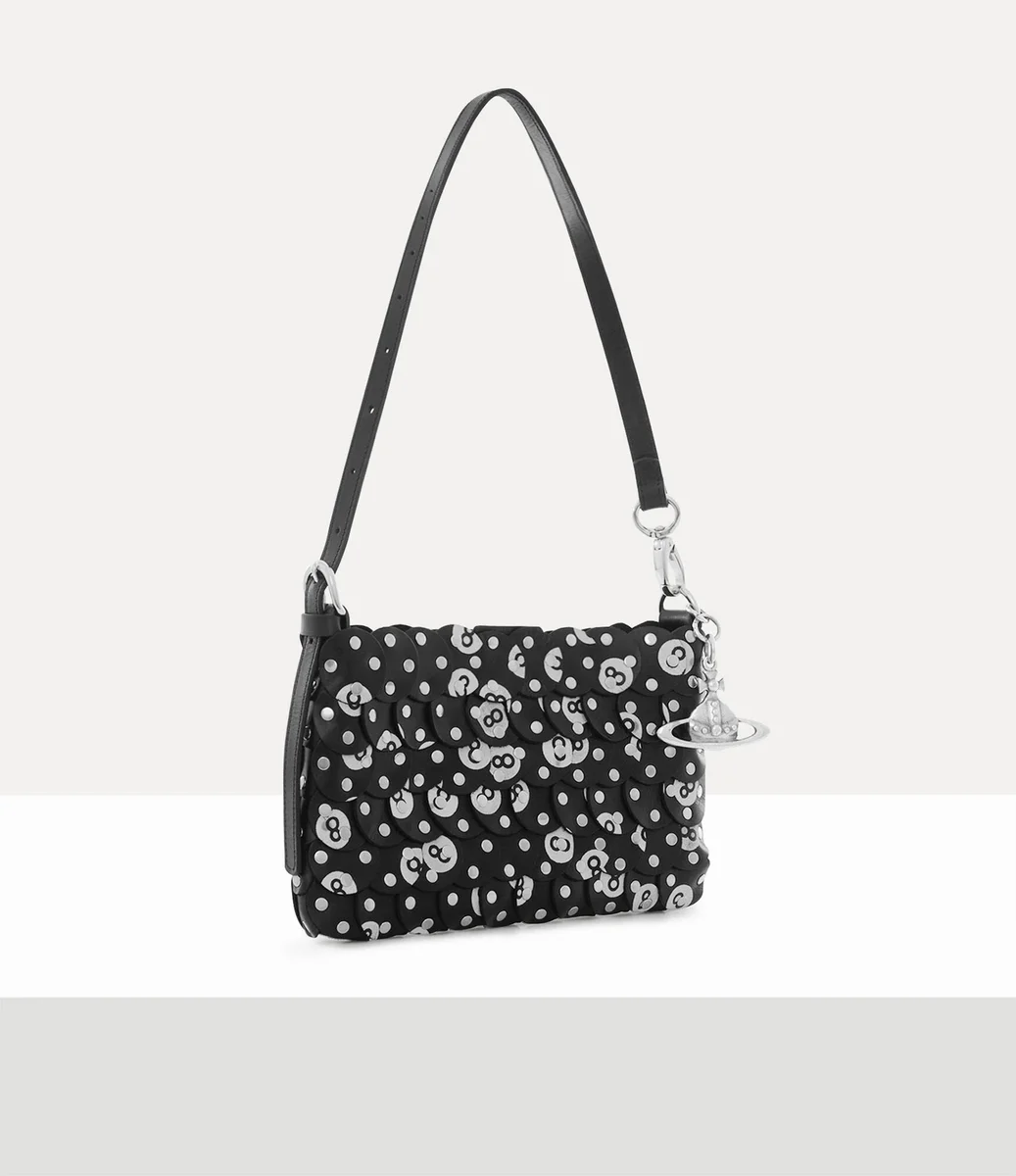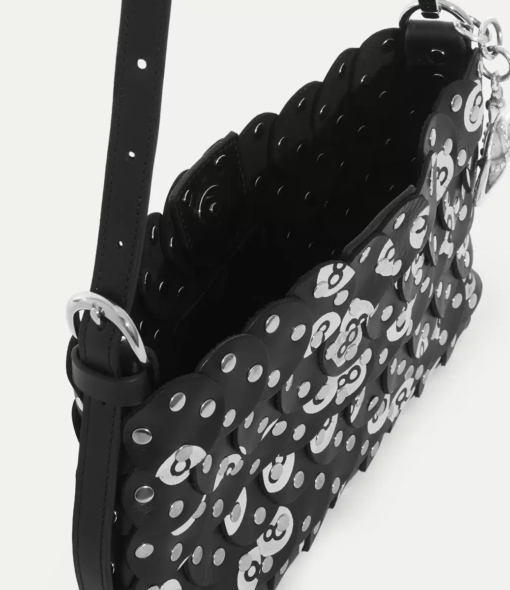 Le sac à bandoulière Lola, créé en partenariat avec l’Ethical Fashion Initiative pour notre collection Made in Kenya, s’inspire des imprimés vintage de bingo et de billard. Sa silhouette est composée de cercles en cuir découpés à la main, ornés de clous argentés « 8 Ball » appliqués à la main.