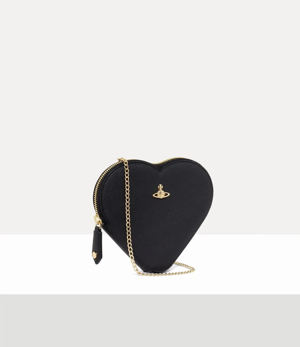 Le sac à bandoulière New Heart présente une silhouette en forme de cœur, rappelant l’affection de Vivienne pour l’humanité et la planète. Il est orné d’un motif en forme de globe doré clair sur le panneau avant, symbolisant la tradition, entouré des anneaux célestes de Saturne, représentant l’avenir.