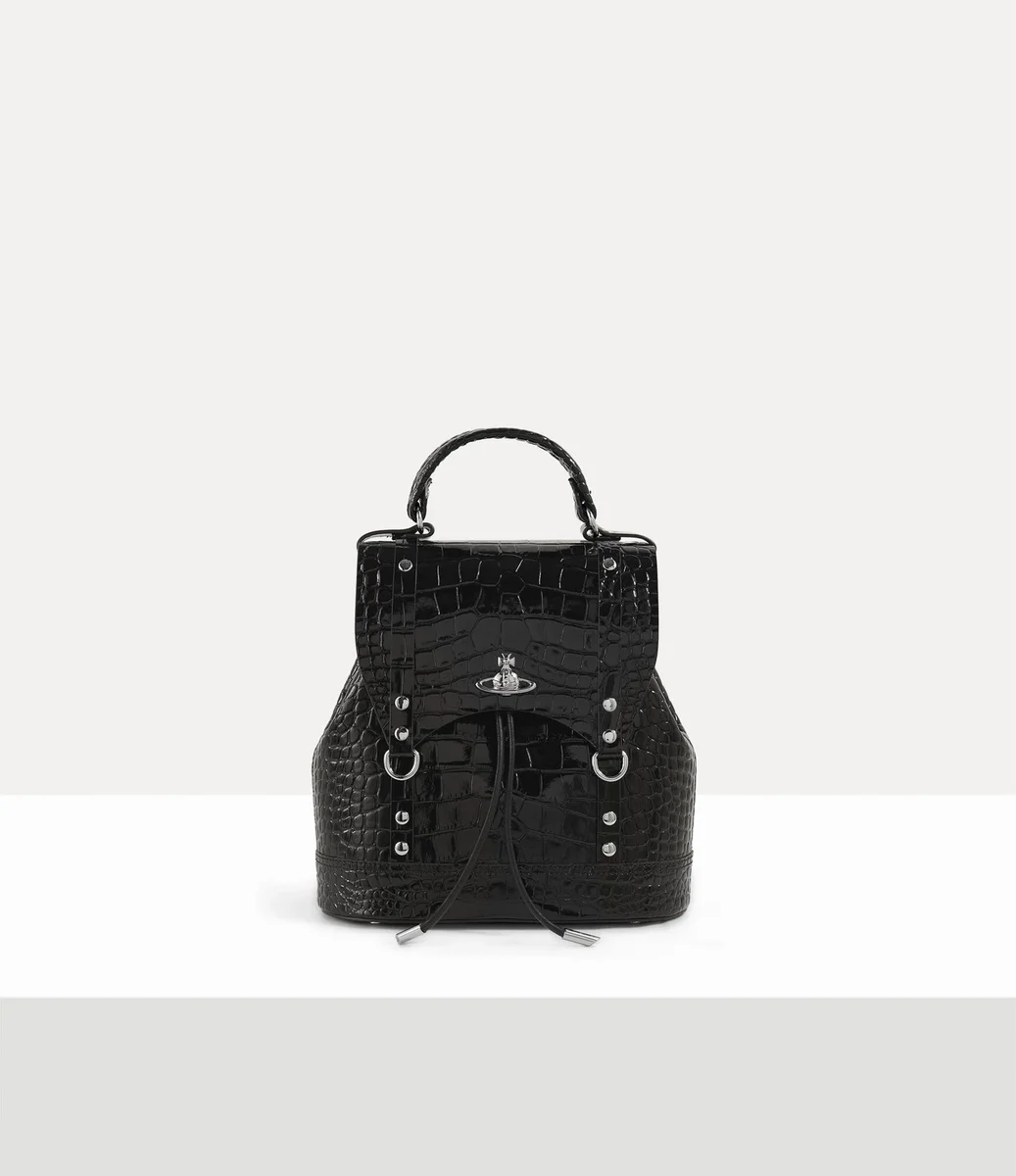 Notre sac à dos Max Small emblématique est proposé dans une finition en cuir gaufré effet croco, avec une texture vernie qui rappelle le latex liquide et les vêtements en caoutchouc vendus dans notre boutique iconique Sex. Cette pièce présente des éléments inspirés du bondage, qui rappellent notre collection « Erotic Zones » du printemps-été 1995.