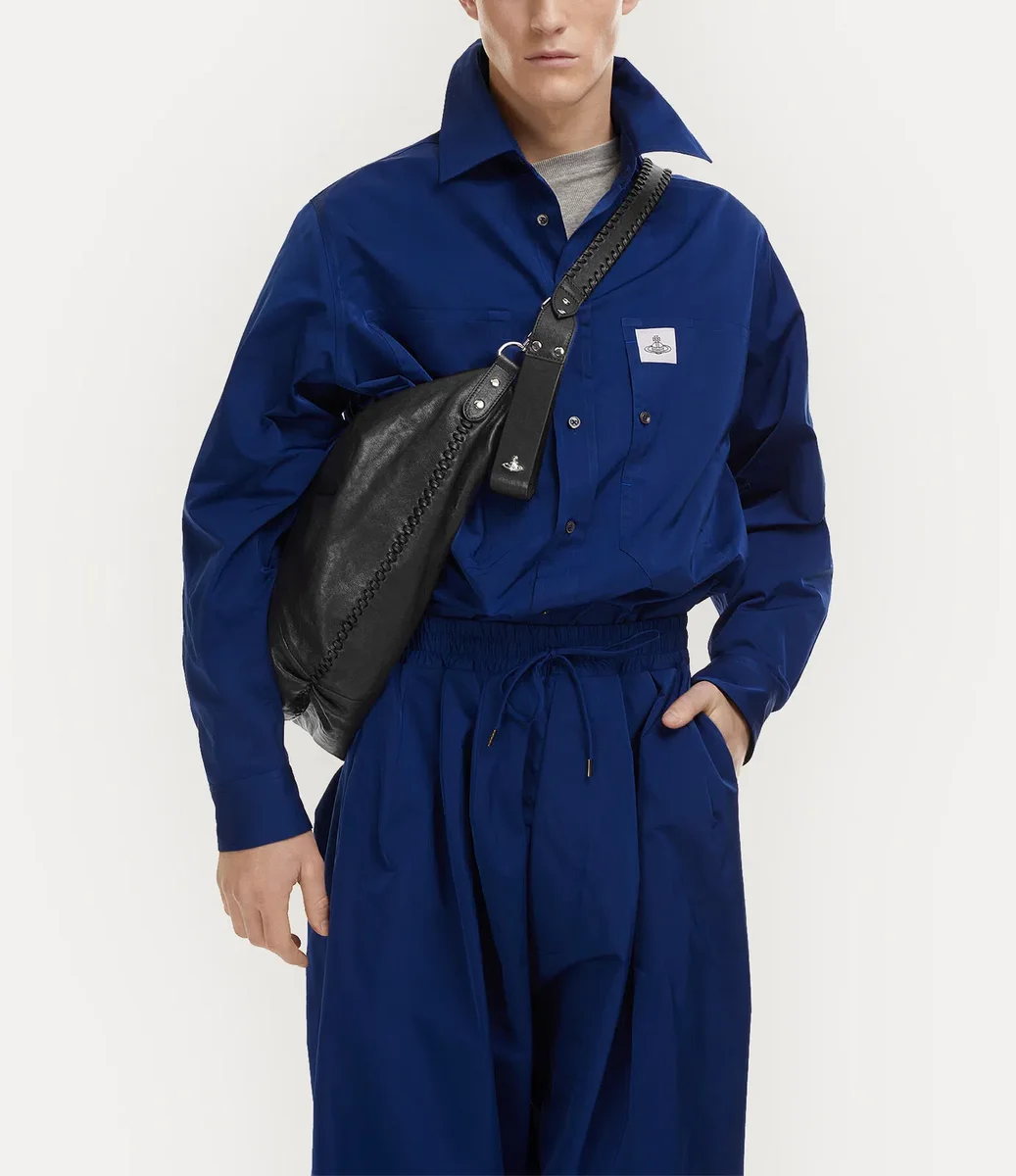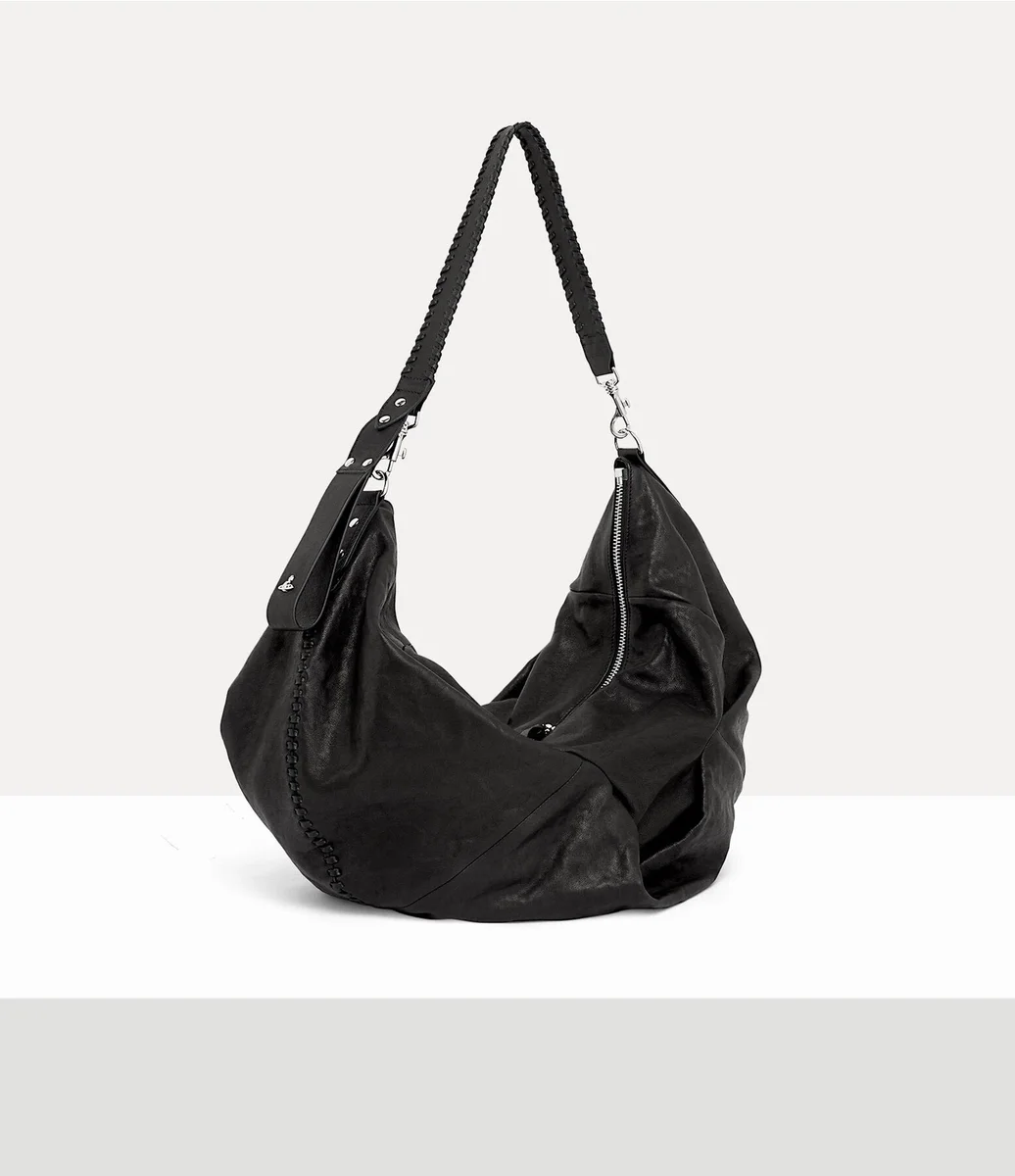 Notre grand sac à bandoulière Agnes présente une silhouette drapée, inspirée des techniques de coupe courbes utilisées pour la première fois dans notre collection automne-hiver 2001, « Wild Beauty ». Le design se caractérise par une finition en cuir délavé et une poignée en cuir tressé, rappelant les fouets bondage vendus dans notre boutique emblématique SEX.