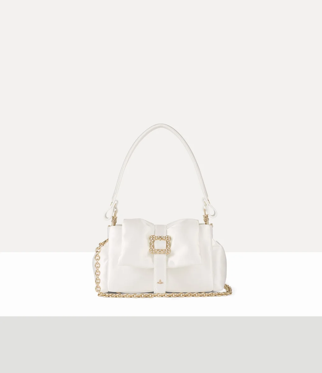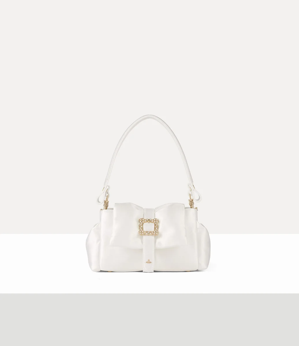 Notre sac à main Hazel Mini Treasure est confectionné dans un mélange de soie et présente une poignée supérieure, ainsi que notre doublure bleu pastel signature et des détails métalliques polis. Une sangle sculpturale entoure la silhouette douce, ornée d’un charm décoratif en forme de globe et finie par une boucle opulente incrustée de cristaux, rappelant la vénération de Vivienne pour l’histoire de l’art.p>