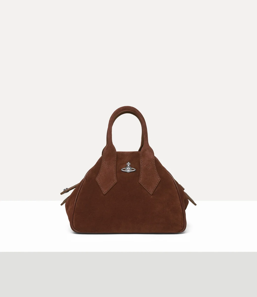 Notre petit sac Yasmine est confectionné en cuir suédé souple et orné d’un motif orb en bas-relief brillant sur le devant. Il est doté d’une doublure intérieure en coton doux « Broken Pinstripe », une version unique du motif à fines rayures traditionnel, apparu pour la première fois dans la collection automne-hiver 2015 de Vivienne Westwood Gold Label.