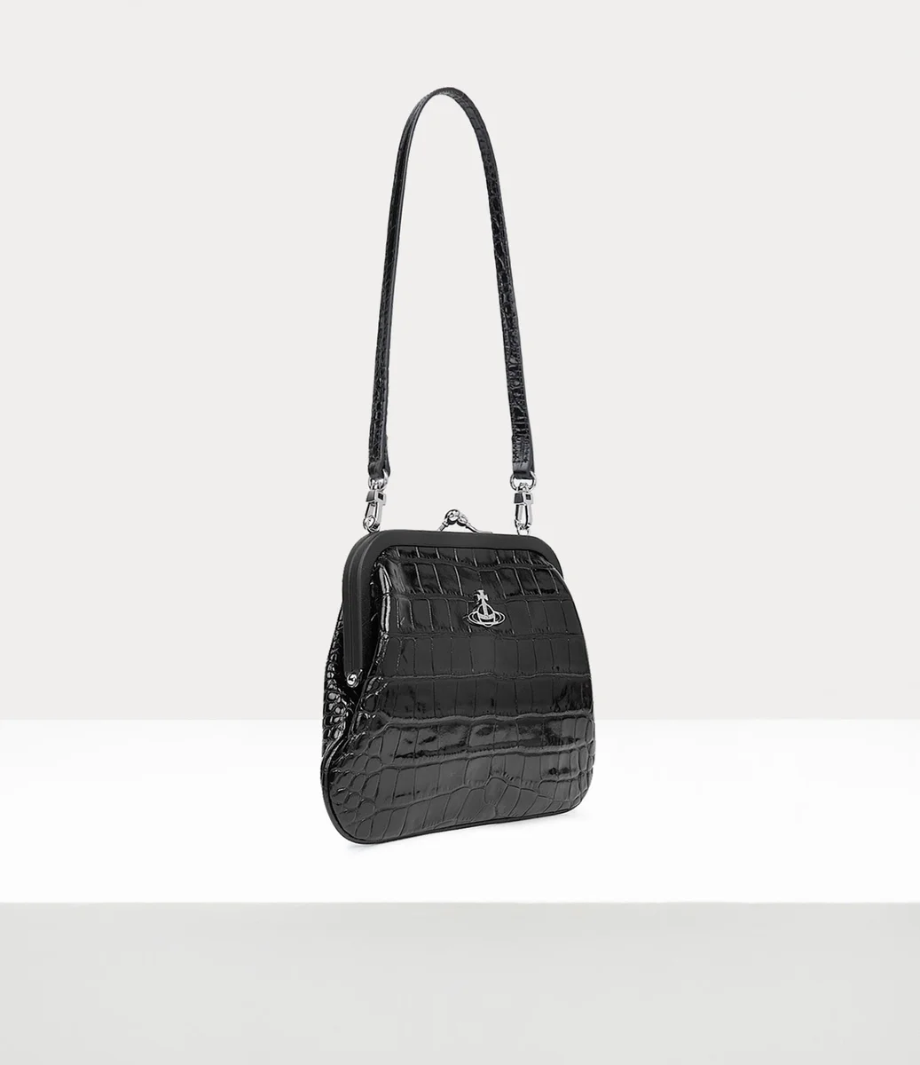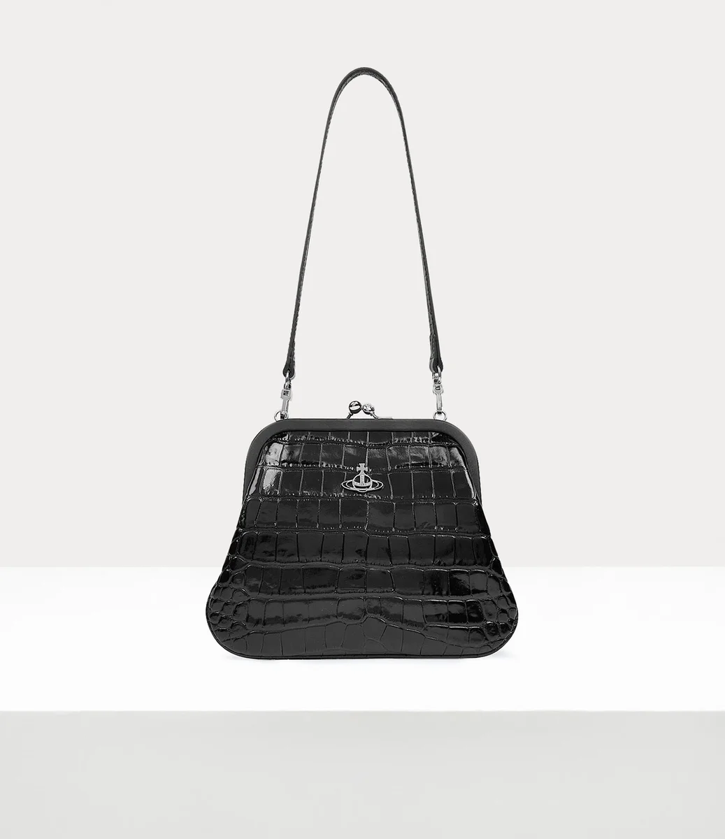 Notre pochette Vivienne est proposée dans un cuir brillant, avec un fermoir vintage et un motif croco en relief sur l’ensemble du design. Elle tire son nom de Vivienne, qui affectionnait ce style, et est ornée de notre motif « Line Orb » signature sur le panneau avant.