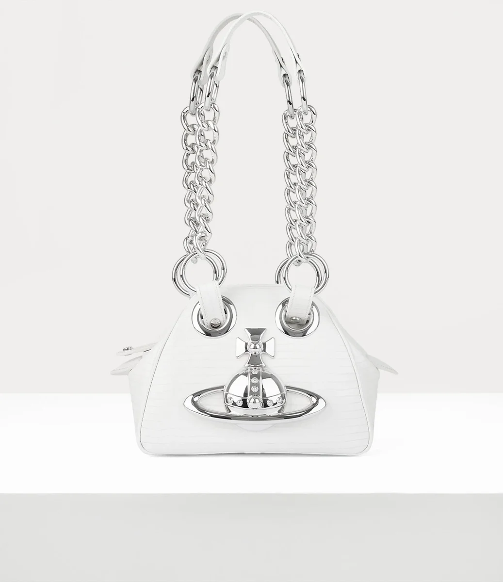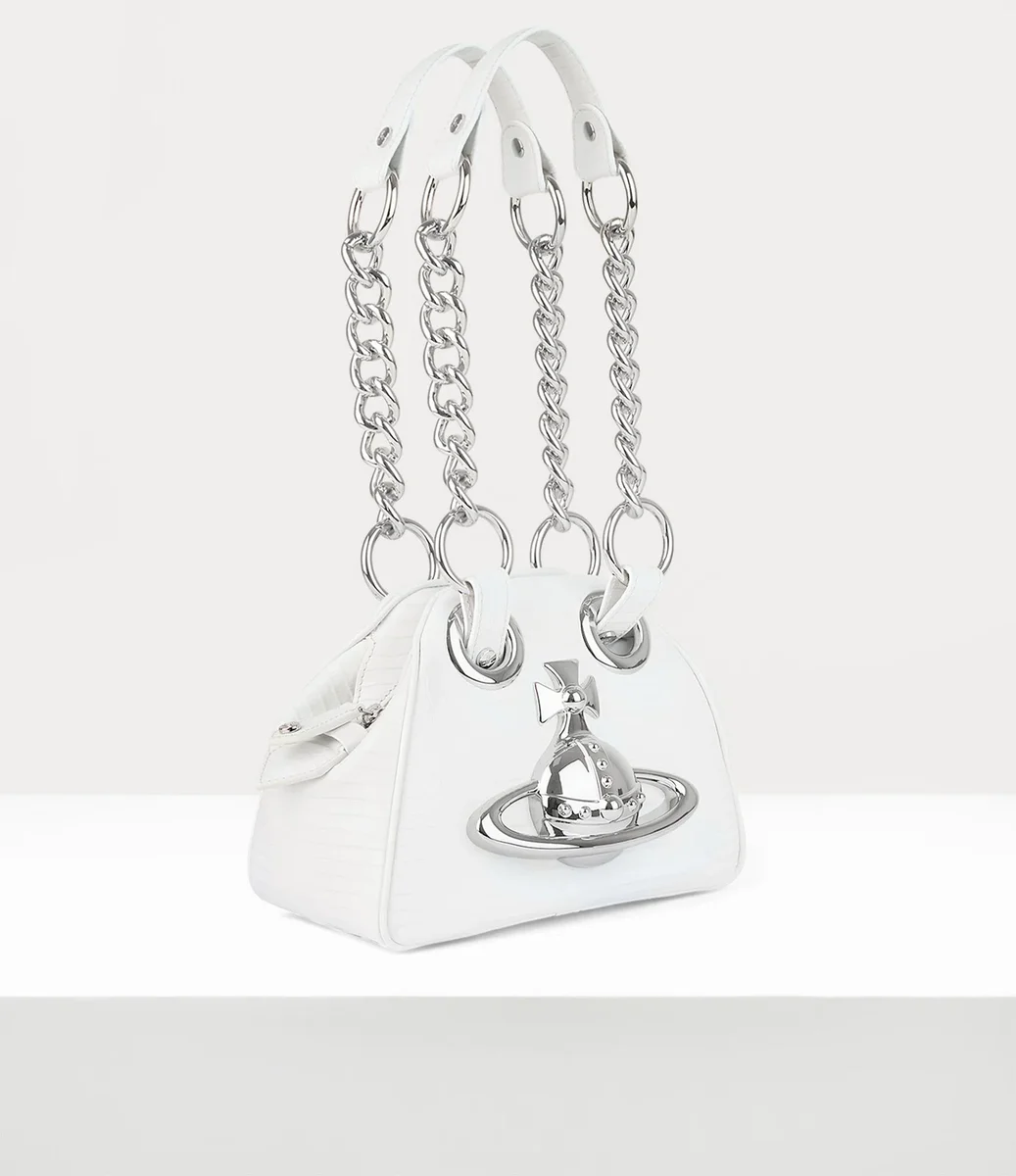 Notre sac à main Archive Orb Chain, apparu pour la première fois dans la collection printemps-été 1991 « Cut, Slash & Pull » de Vivienne Westwood, a été revisité cette saison dans un cuir gaufré effet croco « Mini ». Il arbore un grand motif orb tridimensionnel sur le panneau avant, complété par des anneaux inspirés du bondage et des détails en chaîne le long des anses.