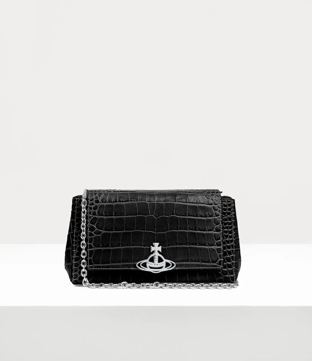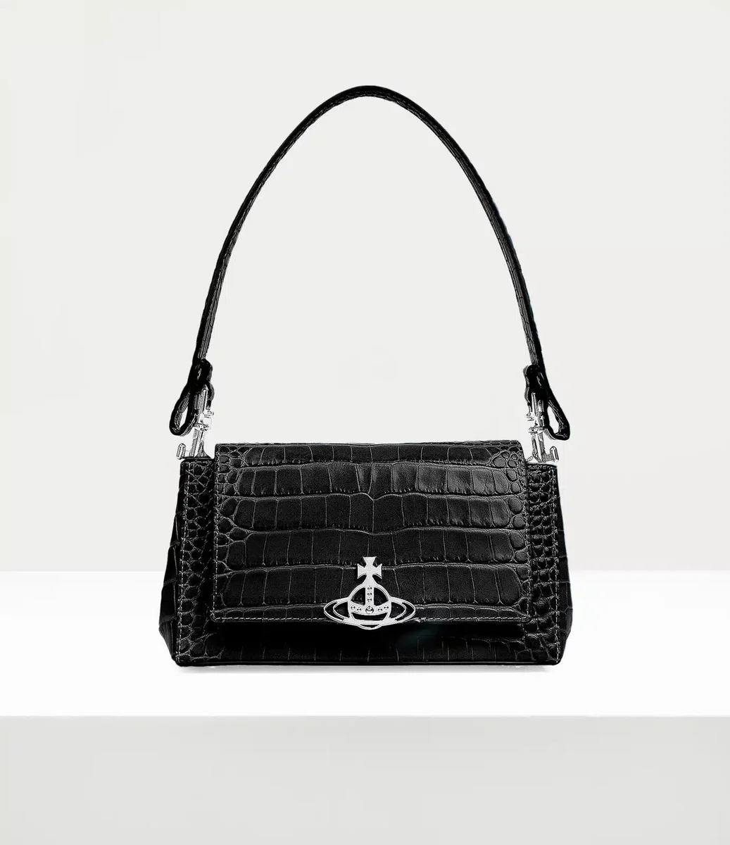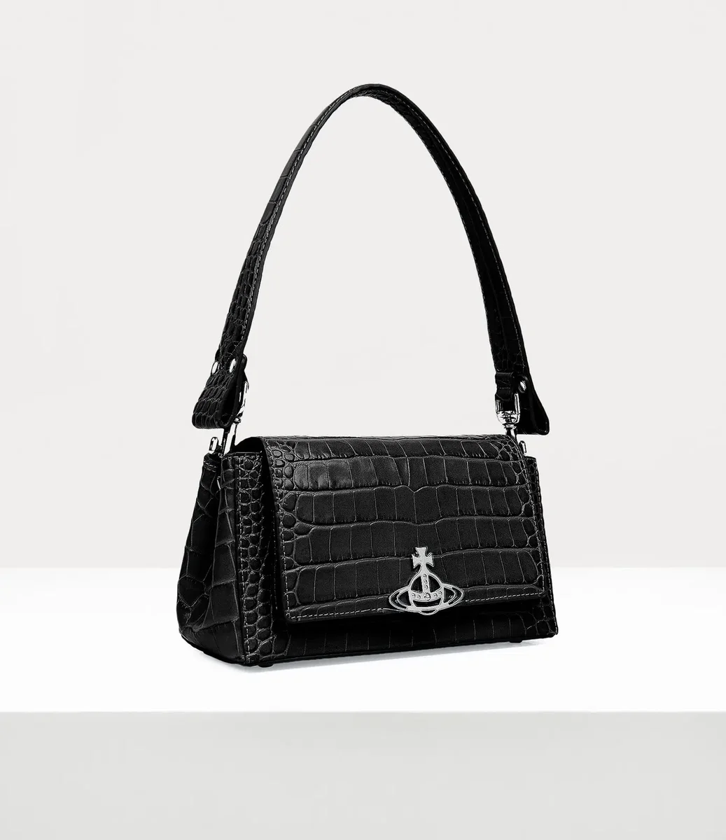 Le sac à main Hazel Medium à motif croco présente une silhouette baguette d’inspiration « soft punk » et s’ouvre pour révéler une doublure à fines rayures et un miroir de courtoisie. La fermeture à rabat sur le devant arbore le motif orb de notre maison, incarnant la vision de Vivienne Westwood qui consiste à mêler le passé et l’avenir.