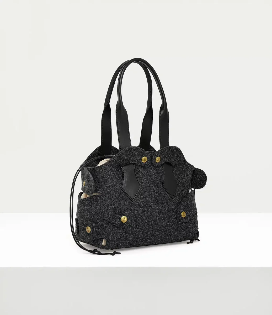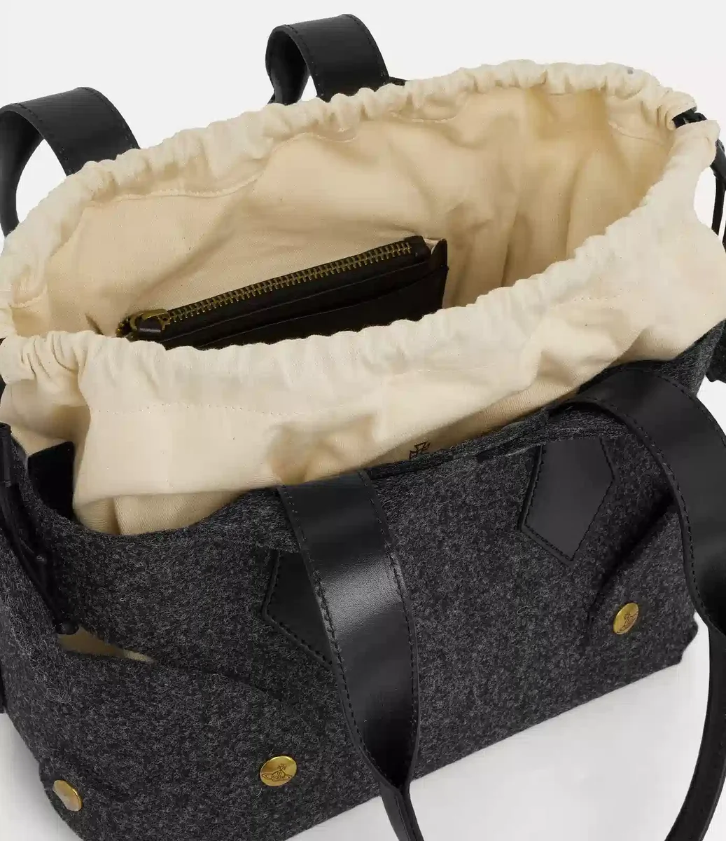 Le petit sac fourre-tout Wilma de Vivienne Westwood est confectionné en feutre de laine épais et doté d’un système de boutons-pression modulables avec des poignées en forme de pointe de lance emblématiques.