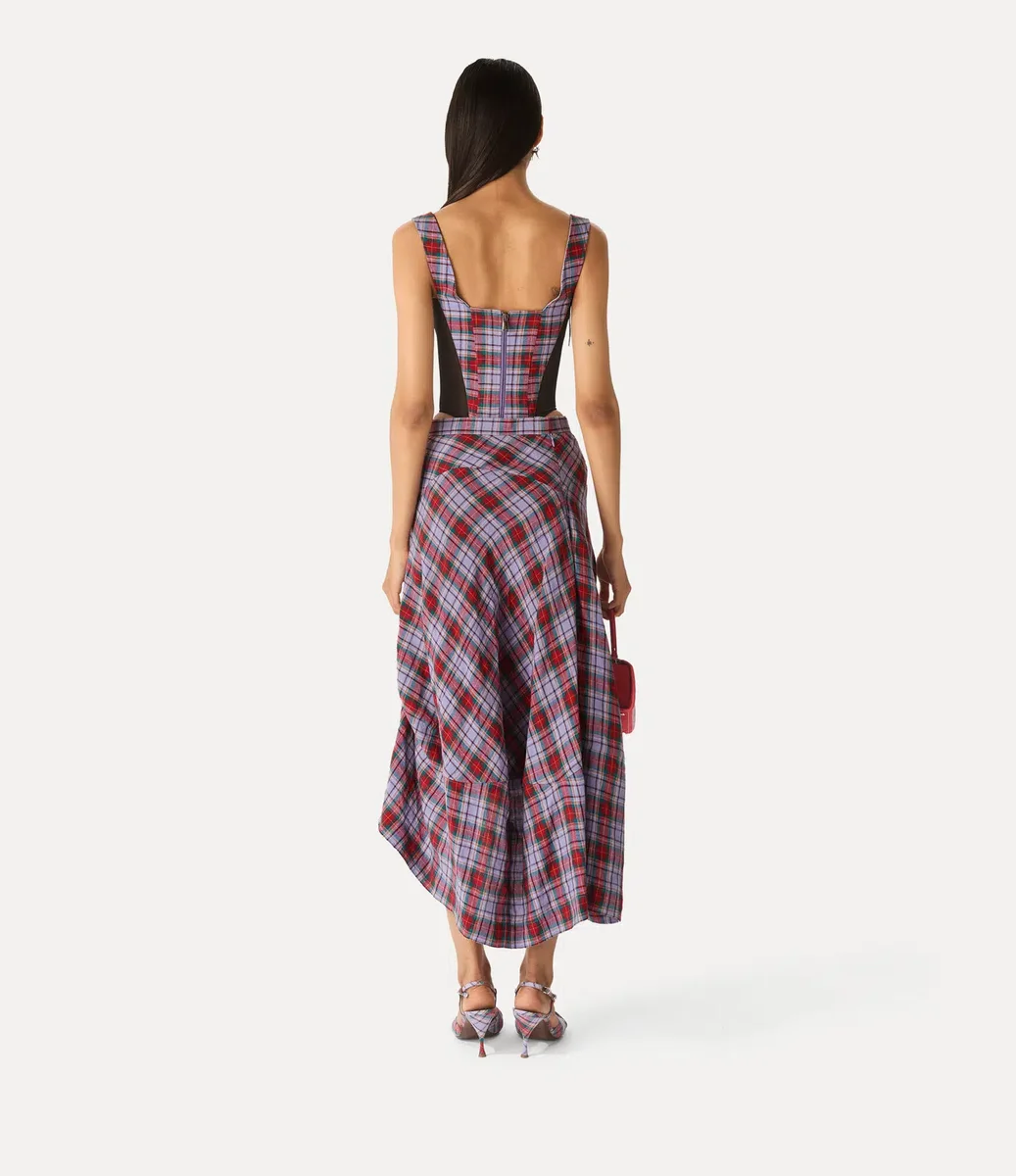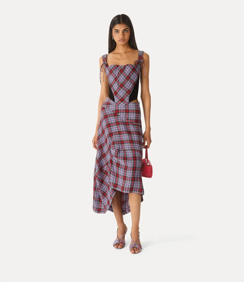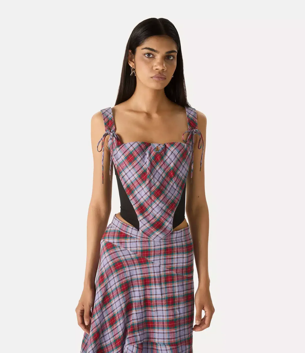 Notre corset Puppy est revisité cette saison avec un motif « Louth Tartan » audacieux, tissé dans des tons rouges, verts et lilas, et rehaussé d’un motif multicolore brodé sur le devant. La pièce présente un décolleté carré légèrement froncé avec des bretelles à nouer, rappelant les silhouettes du XVe siècle, synonymes de la vision de Vivienne qui consiste à faire entrer la tradition dans le futur.