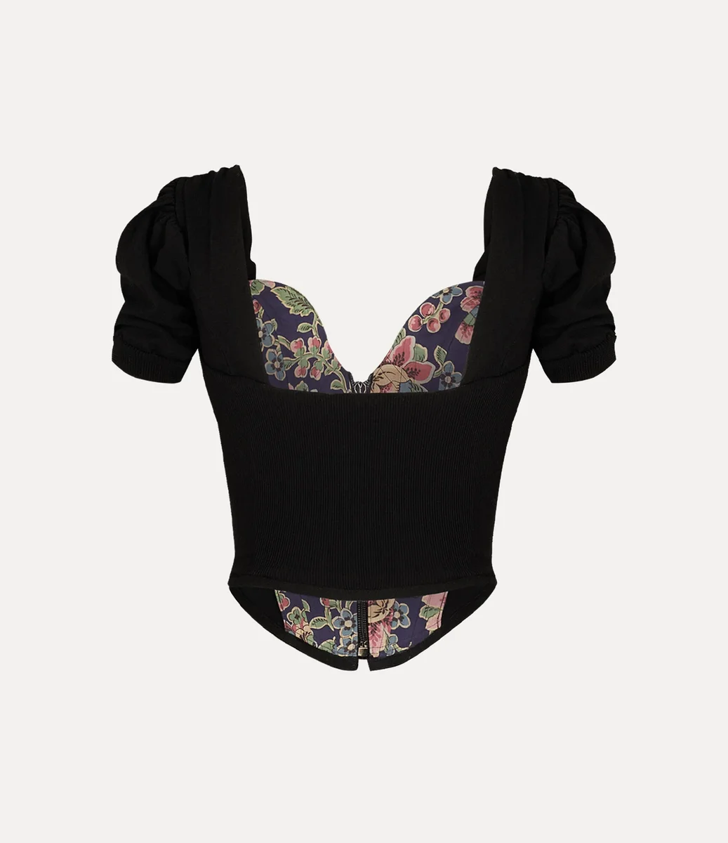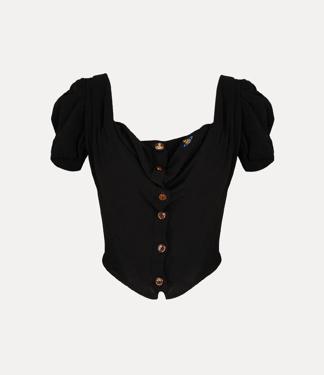 Le cardigan Bea Corset à manches courtes présente un drapé délicat à l’encolure et aux épaules, qui tombe sur un corsage structuré à baleines, fermé par nos boutons classiques de couleur ambre. Le design est orné d’un globe brodé multicolore sur la poitrine, qui incarne la vision de Vivienne de lancer la tradition dans l’avenir.