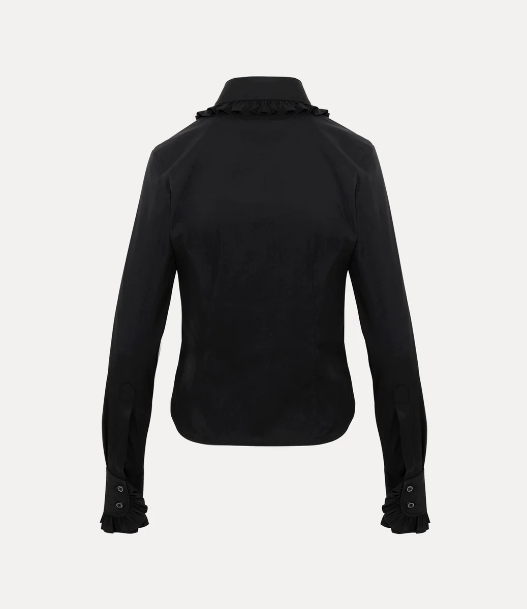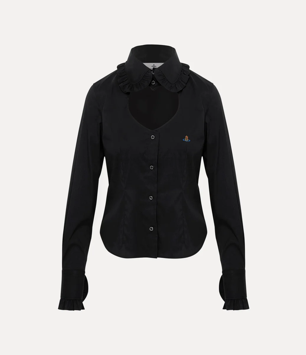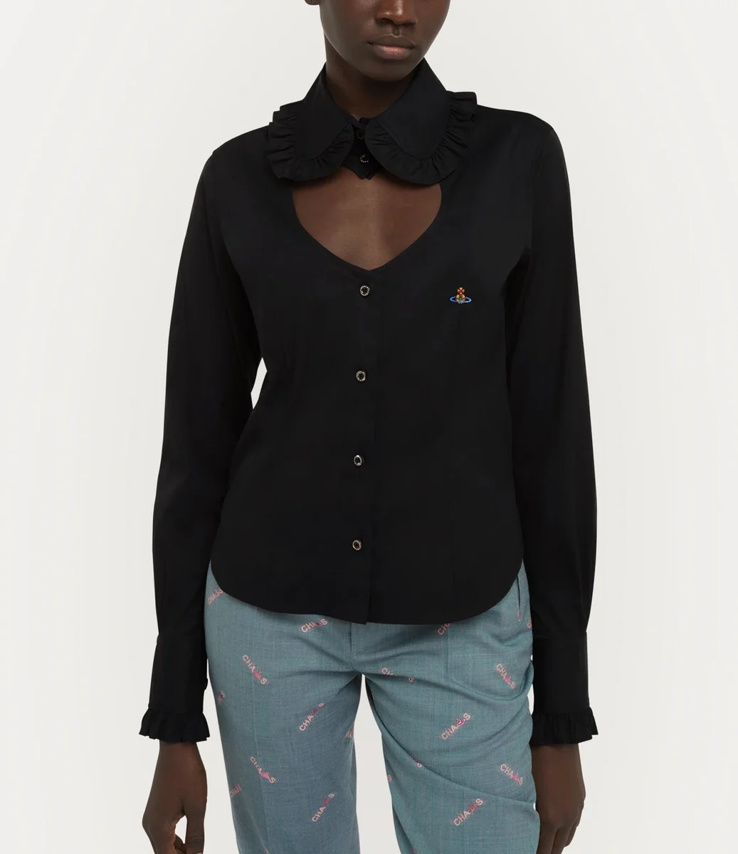 La chemise Toulouse à volants revisite notre coupe archivée avec une découpe en forme de cœur à l’encolure, symbole de l’amour de Vivienne pour l’humanité et la planète. Cette pièce est ornée de notre broderie Orb signature sur la poitrine et d’un col délicatement arrondi, encadré de volants froncés.