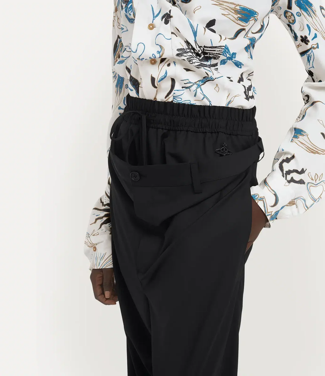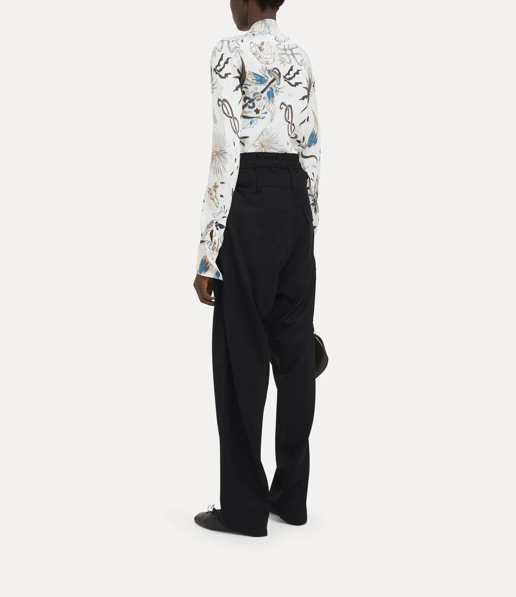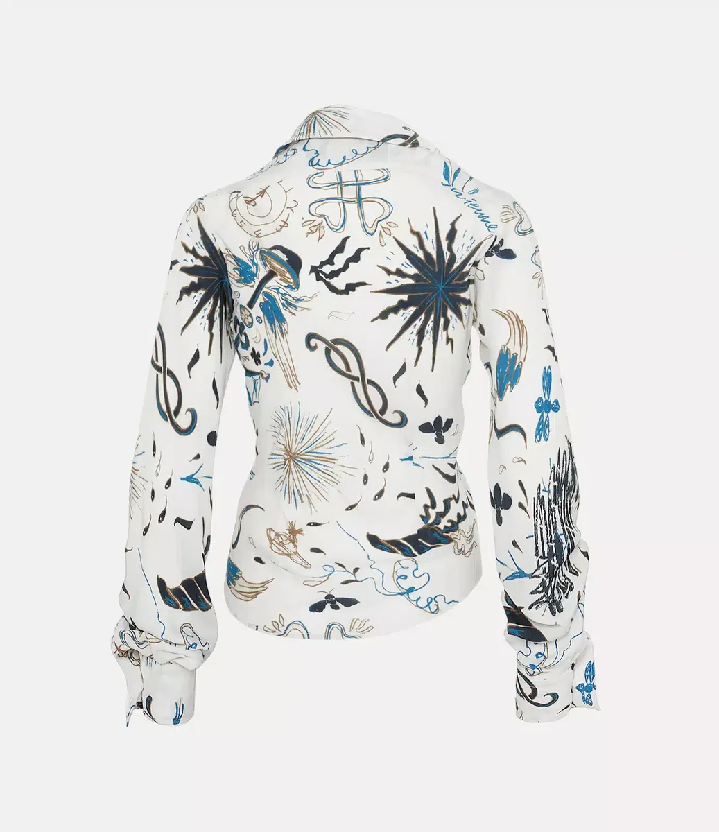 Conçue selon le système de couture expérimentale « drunken » de Vivienne, notre chemise Drunken présente une patte de boutonnage décentrée et un ourlet asymétrique. Inspirée du tableau « Le Cavalier rieur » de Frans Hals, cette pièce est imprimée d’un motif graphique abstrait reprenant l’iconographie emblématique de la maison.