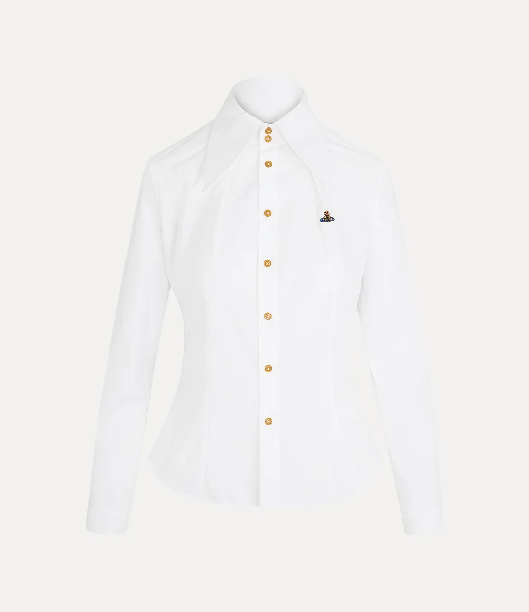 Notre chemise W Violin slim fit présente un col exagéré aux bords pointus, complété par notre fermeture à trois boutons signature. Cette pièce est ornée d’un globe brodé sur le côté gauche de la poitrine, réalisé avec un fil multicolore vibrant, synonyme de la vision de Vivienne qui consiste à propulser la tradition dans le futur.