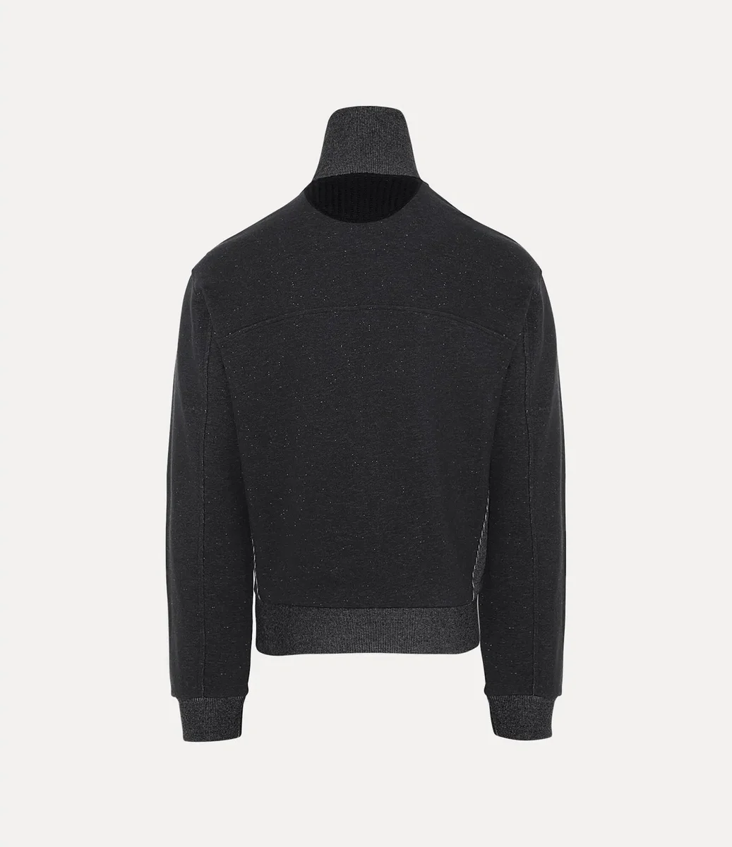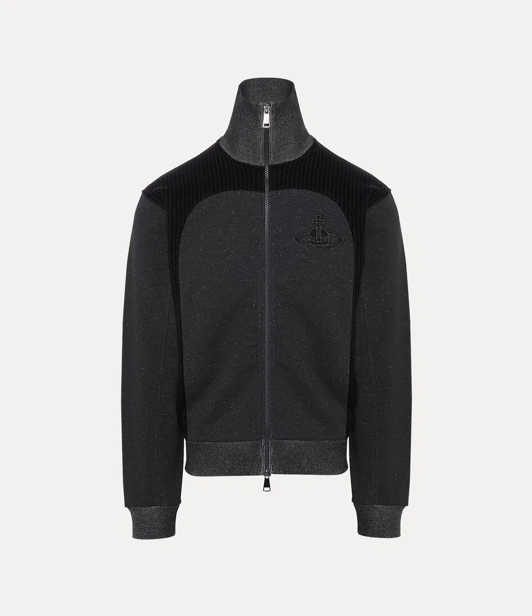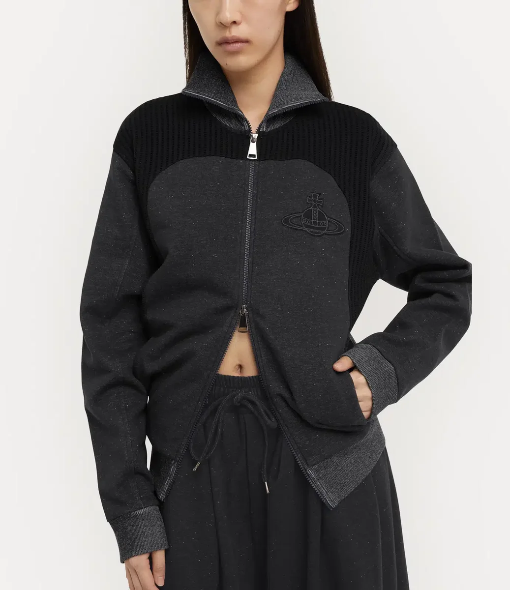 La veste Alien Track de cette saison réintroduit la fermeture à glissière à double sens, un détail utilisé pour la première fois par Vivienne Westwood à la fin des années 1970 et au début des années 1980 comme symbole de non-conformisme et marque de fabrique de son esthétique punk rebelle. Dotée d’un col montant et de panneaux côtelés, cette pièce est rehaussée du motif Graffiti orb de la maison, subtilement brodé sur la poitrine avec un fil ton sur ton.